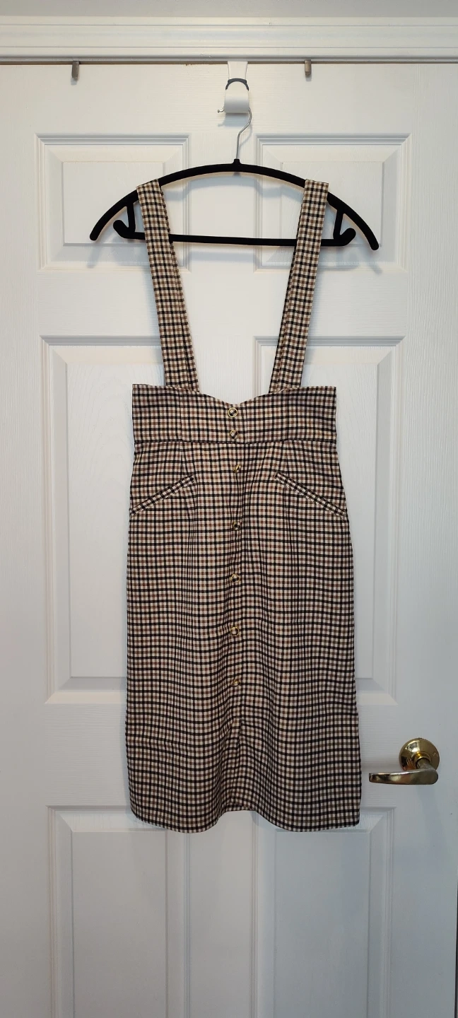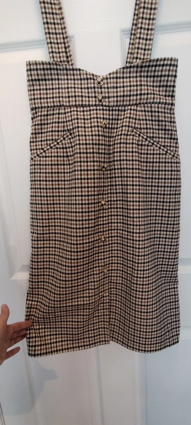 This stylish pinafore dress features a classic plaid pattern in brown, black, and beige. It has adjustable straps, and two front pockets. Made from a comfortable cotton blend fabric. Perfect for a casual outing or layering!