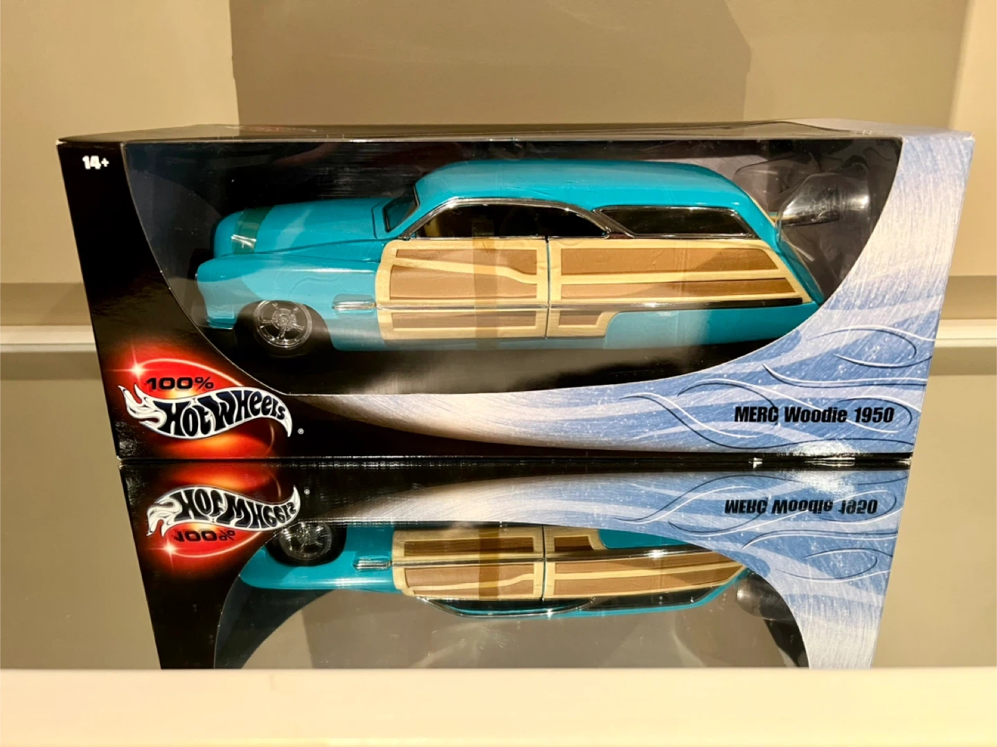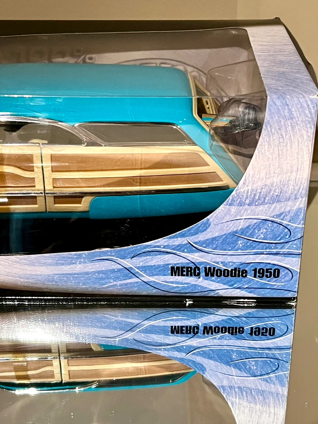 This is a Hot Wheels 1950 Mercury Merc Woodie die-cast model car in turquoise blue.