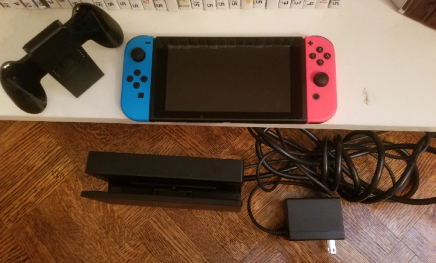 Nintendo Switch console with neon blue and red Joy-Cons. Comes with all original accessories. Lego city undercover game with case, Asphalt legends, rocketball, classic pool racing.