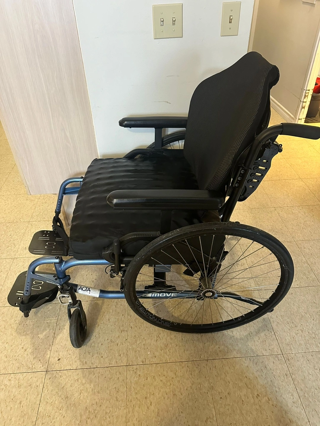 Wheelchair with black fabric seat and back. It has adjustable armrests and footrests. It is in used condition. Comes with 2 cushions, one of them is a like new roho cushion, which is only 2 months old.