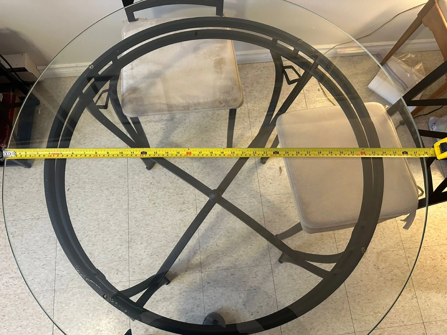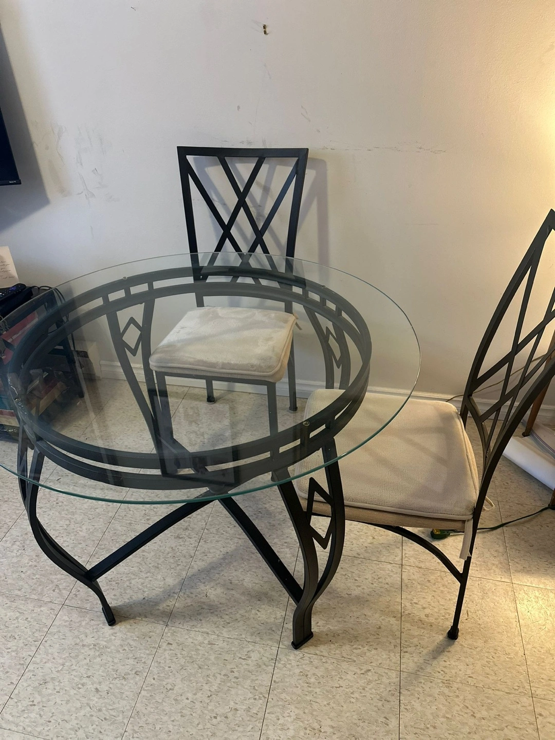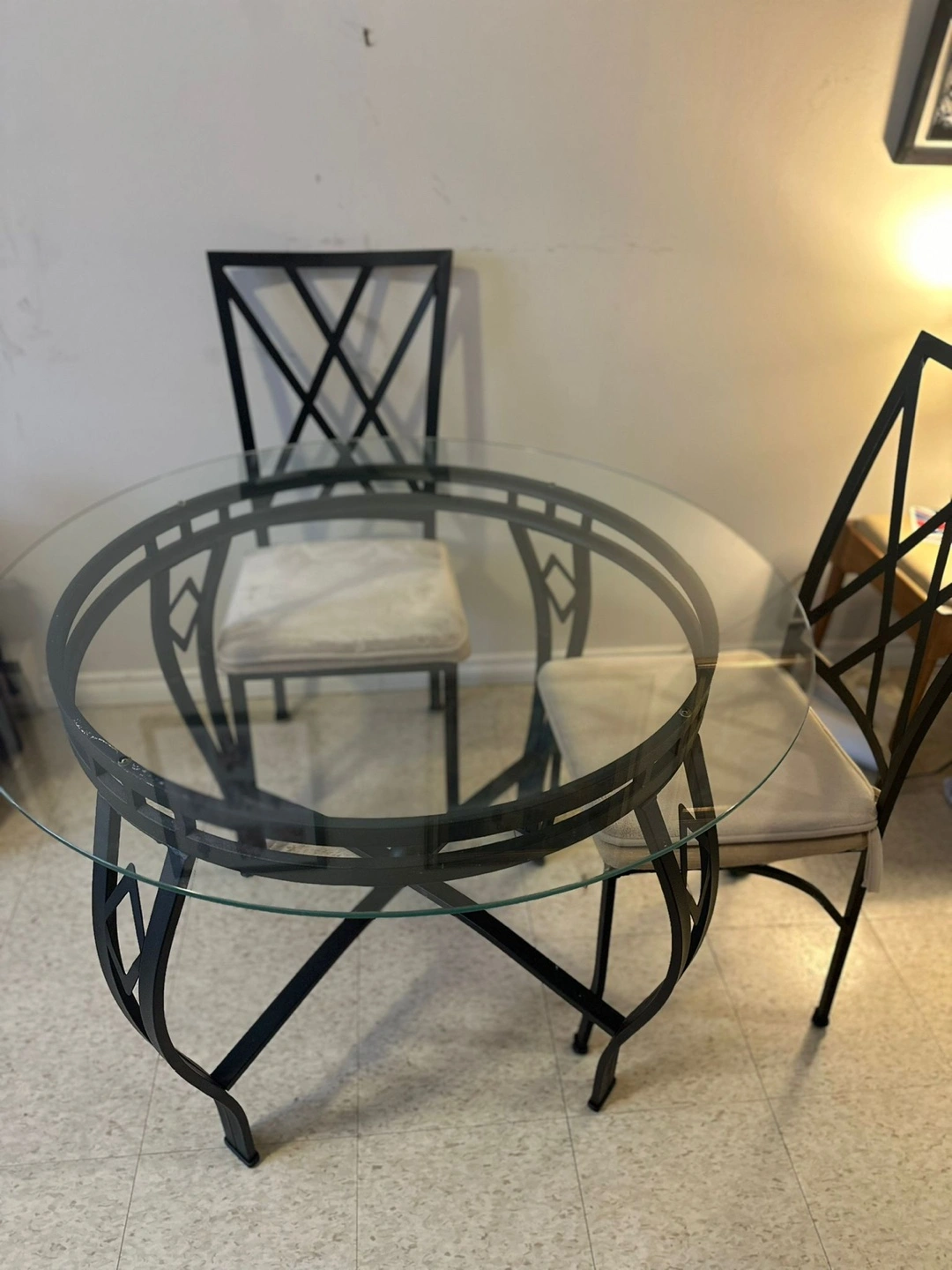 Round glass top table with black metal base. Four chairs with black metal frames and off-white cushions. Good condition. Measurements are in the pictures.