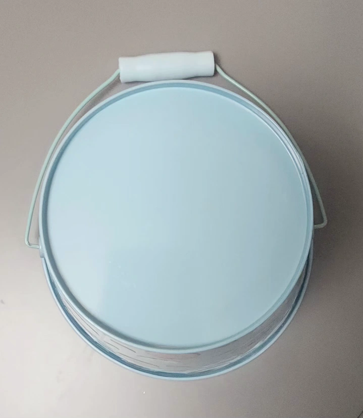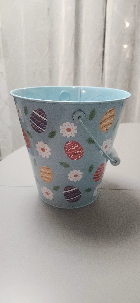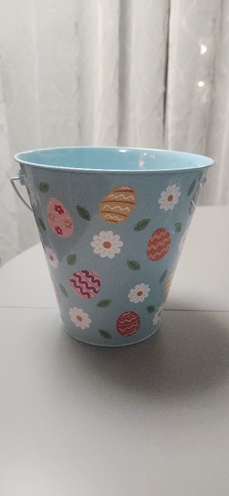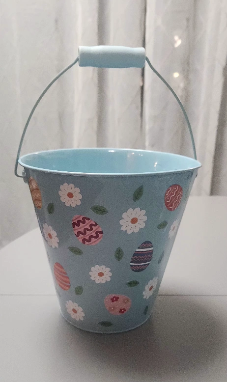 Large Easter bucket with handle made of blue metal and decorated with colorful Easter eggs, flowers and leaves. Measures approximately 7.5" high, diameter of 7.75" and a base of 4 5". New condition.