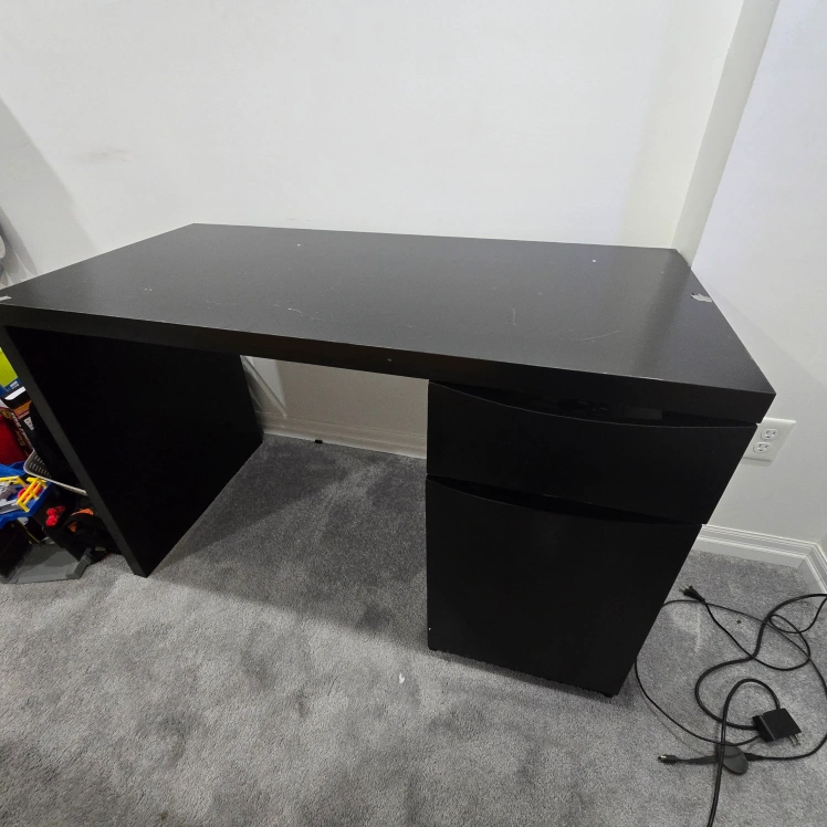 Black desk with one drawer and a shelf, some wear and tear on the surface. Good condition, sturdy and functional.