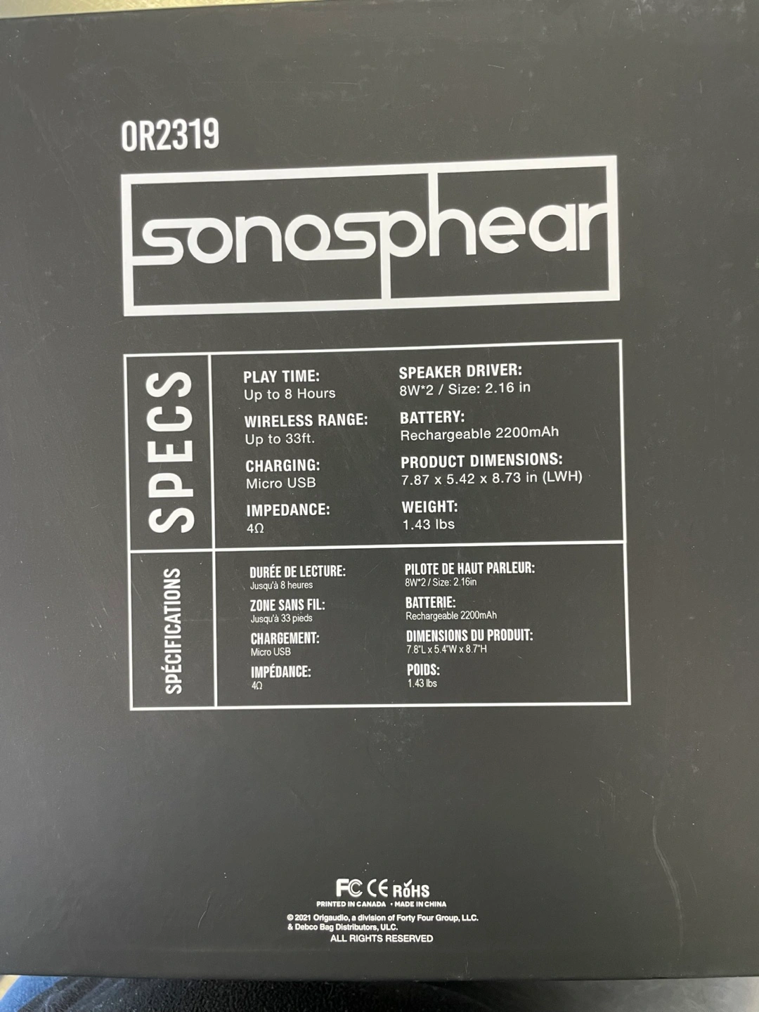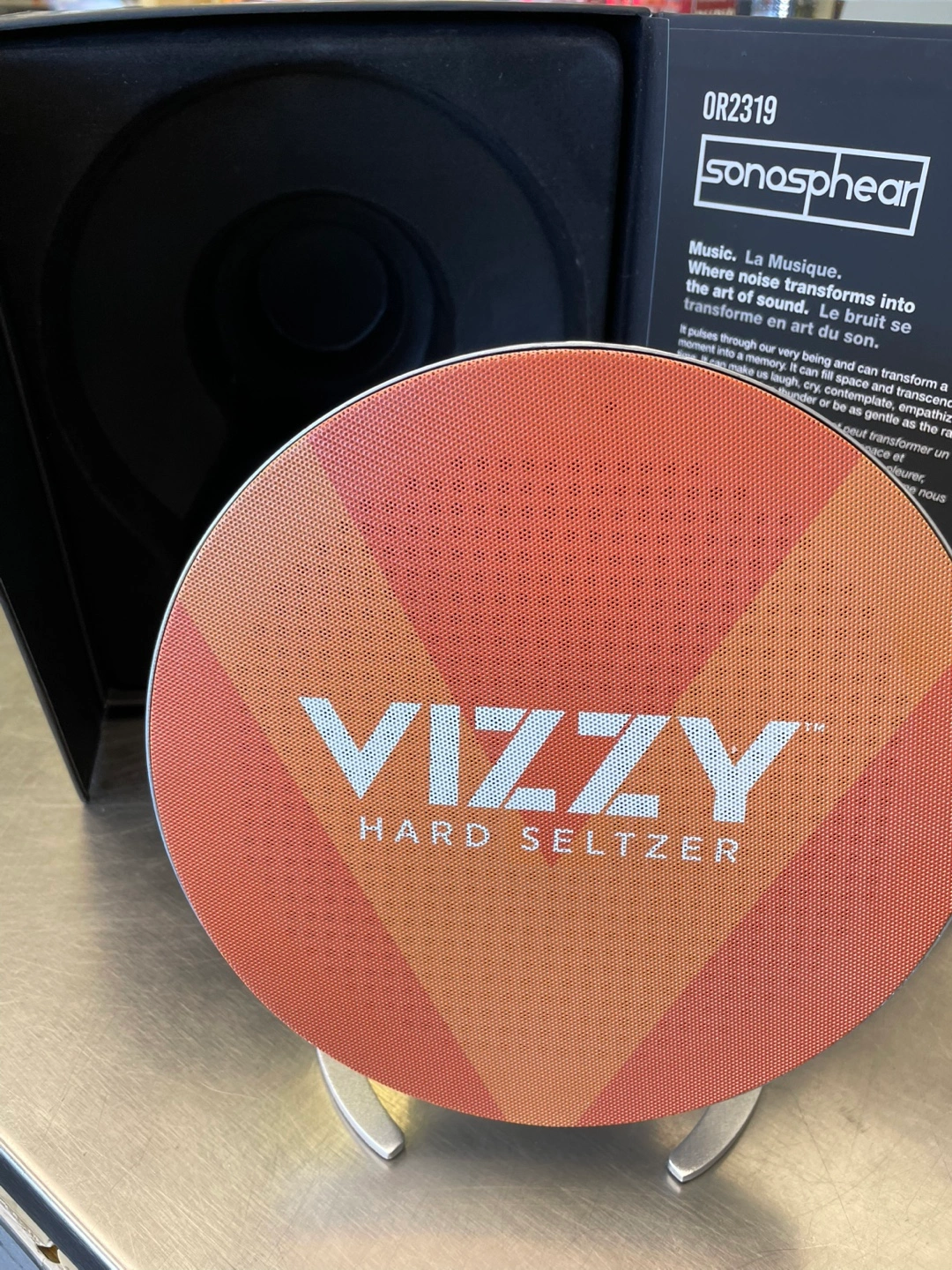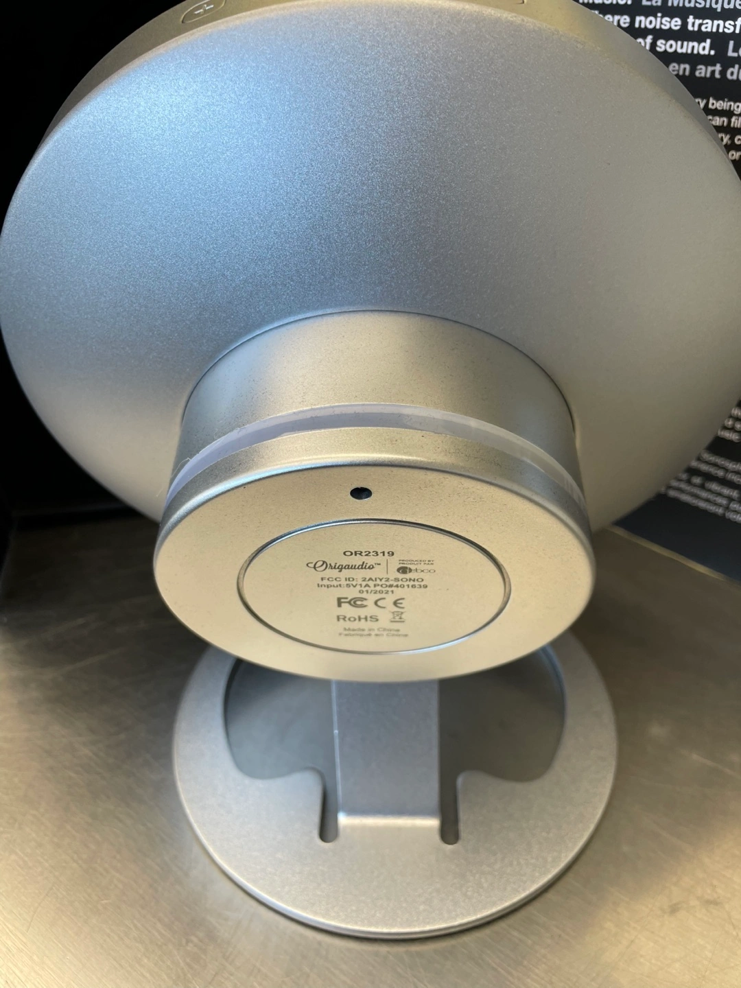 Portable Bluetooth speaker, circular design, silver and red colour scheme, with a stand. Includes a box and charging cable.