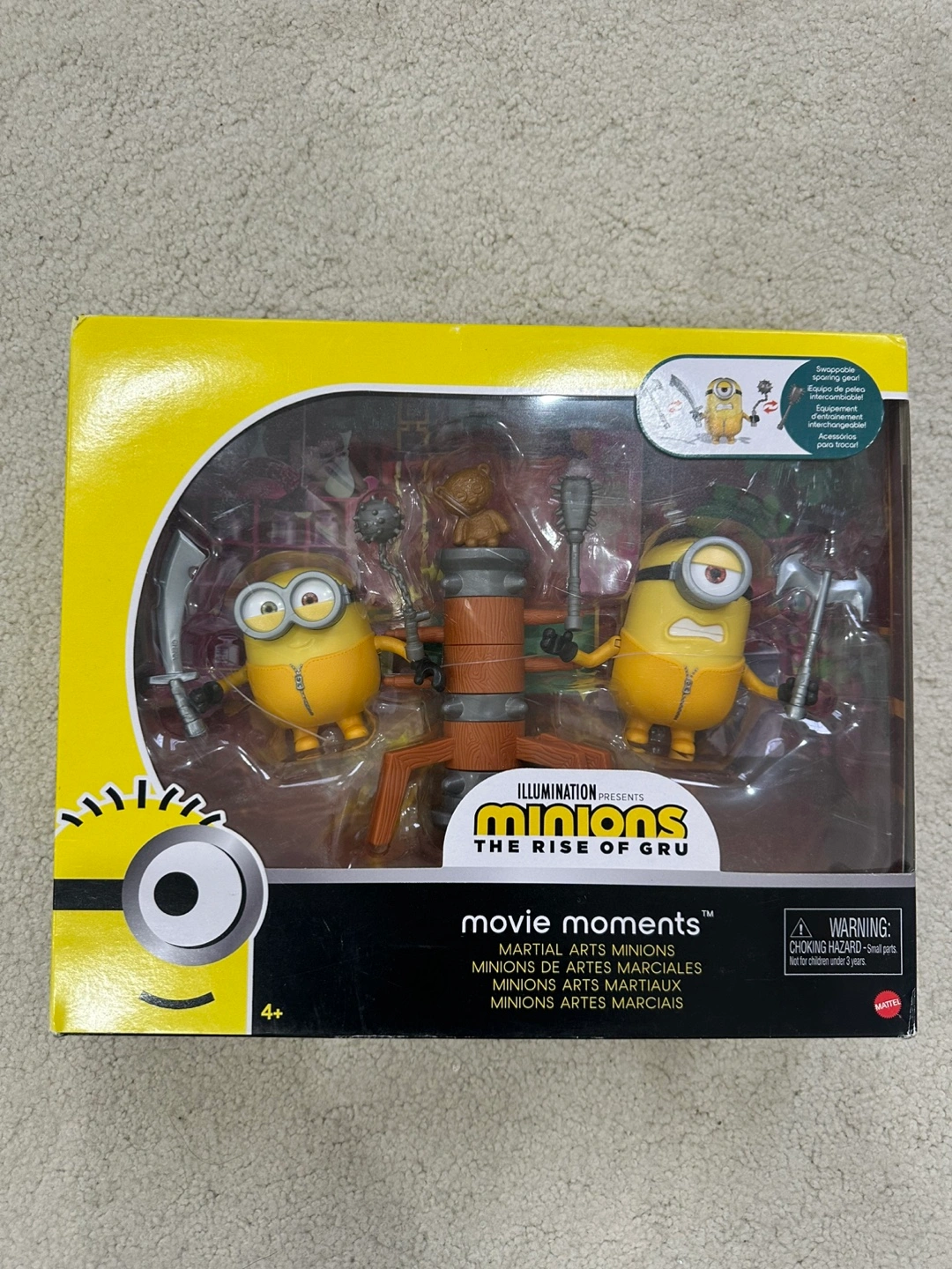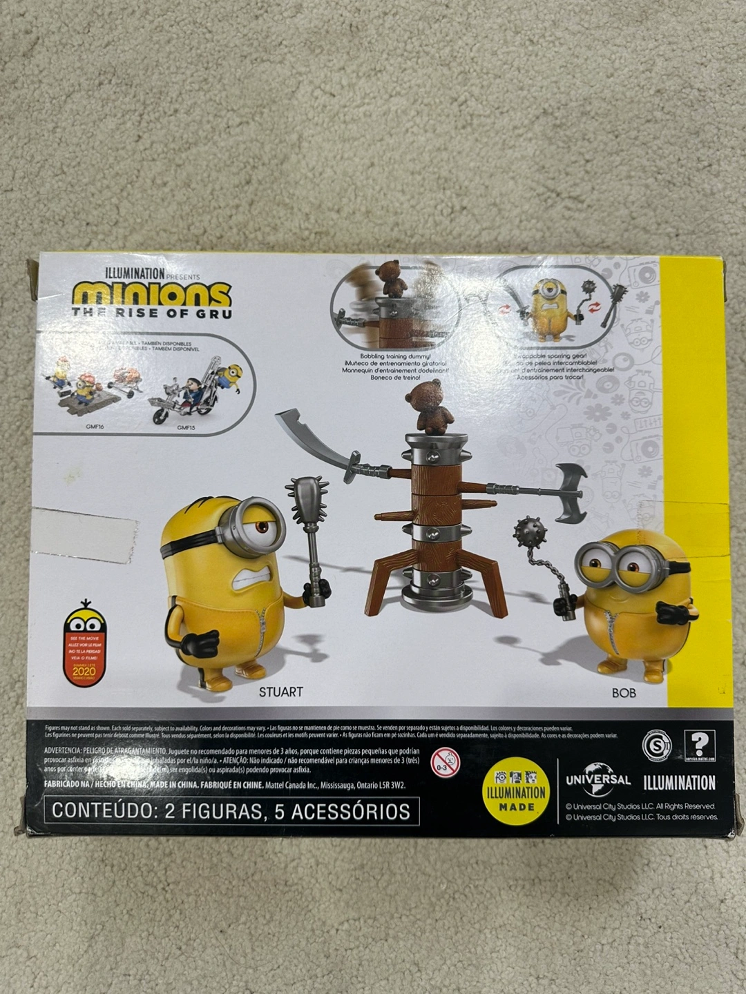 Two Minions figures, a training dummy, and weapons. Swappable training gear. Includes Bob and Stuart.