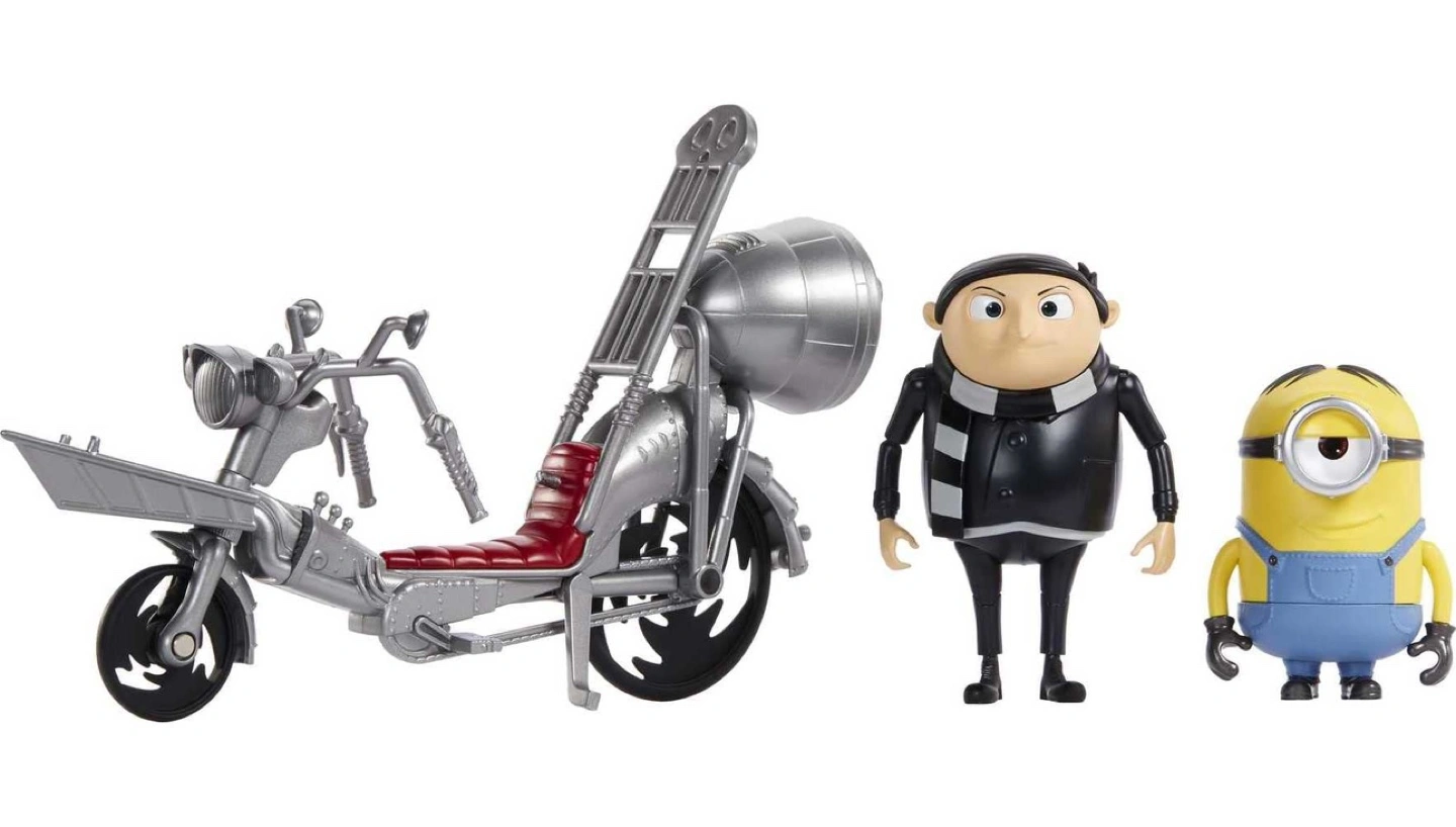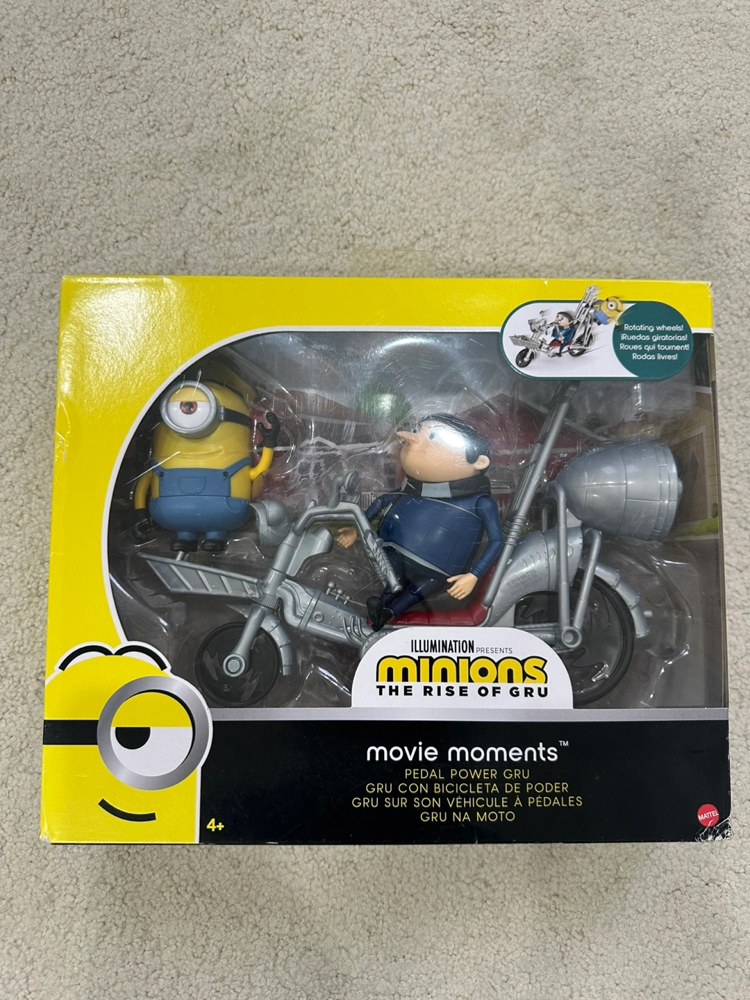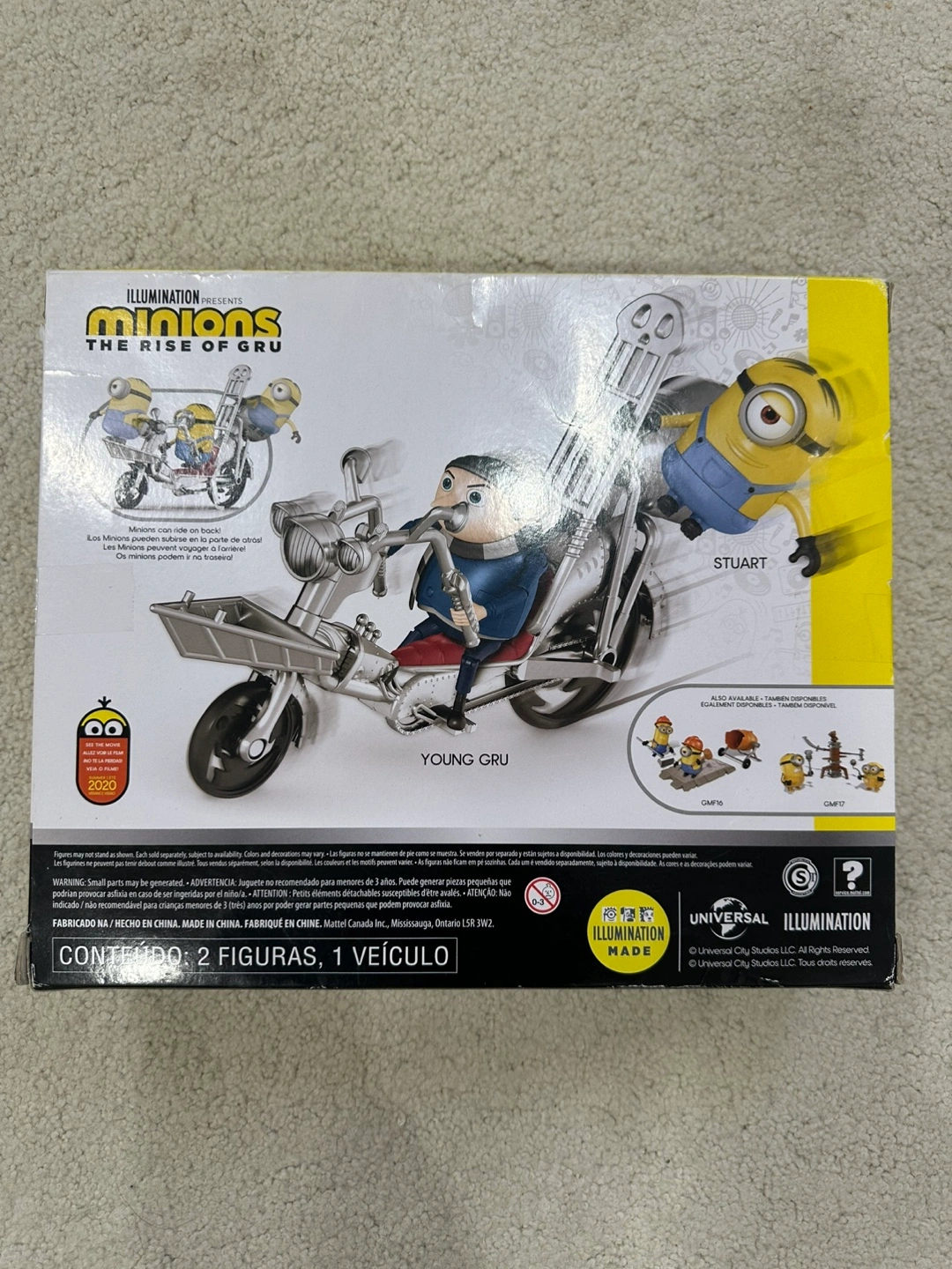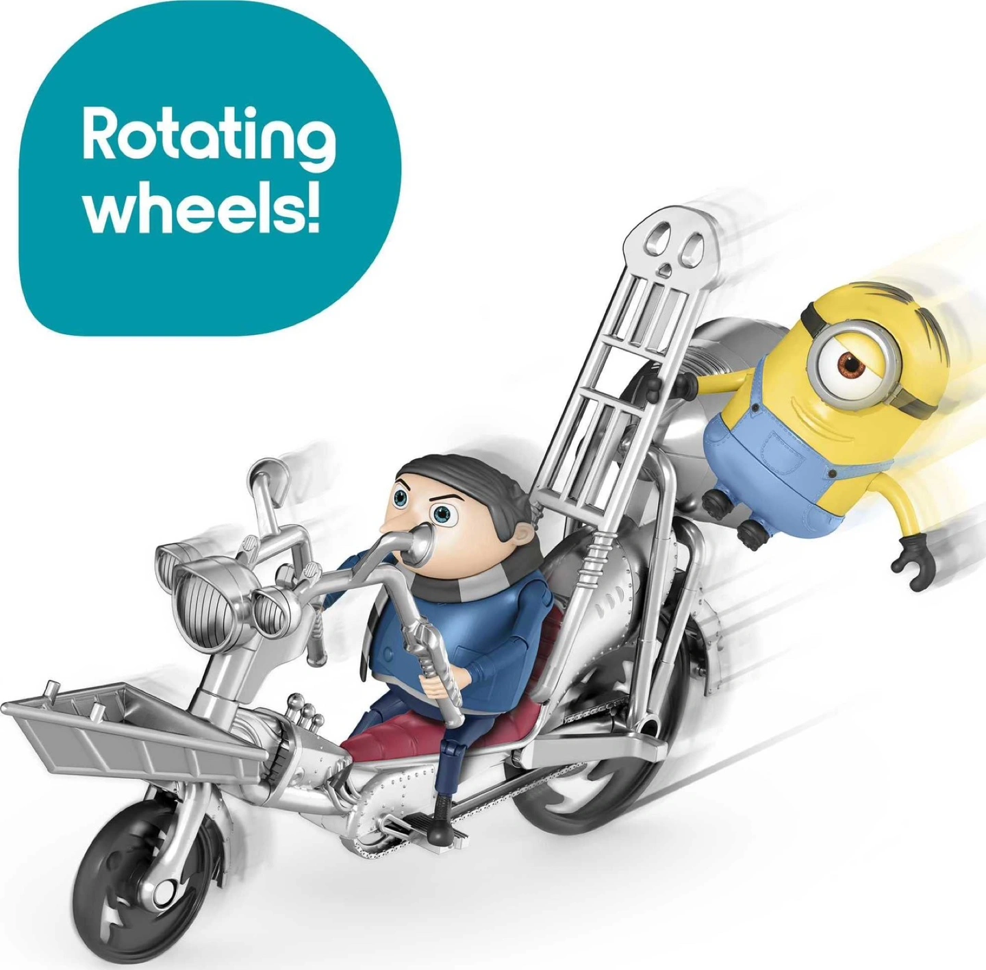 Includes Young Gru and Stuart figures. Rotating wheels. Pedal power Gru on motorcycle.