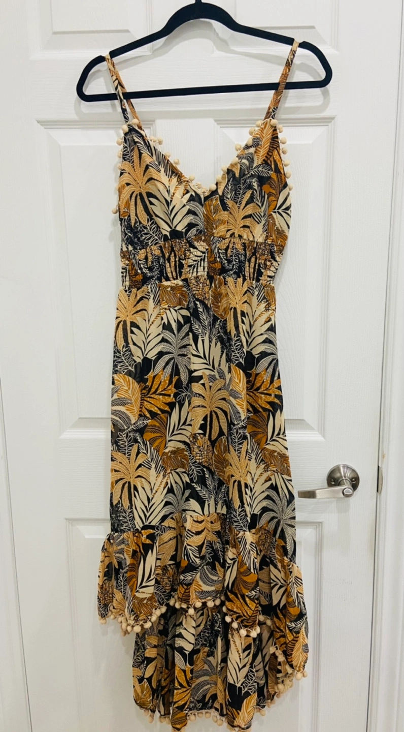 This stunning maxi dress it features a dainty, ruffled hemline shorter in the front and longer in the back.