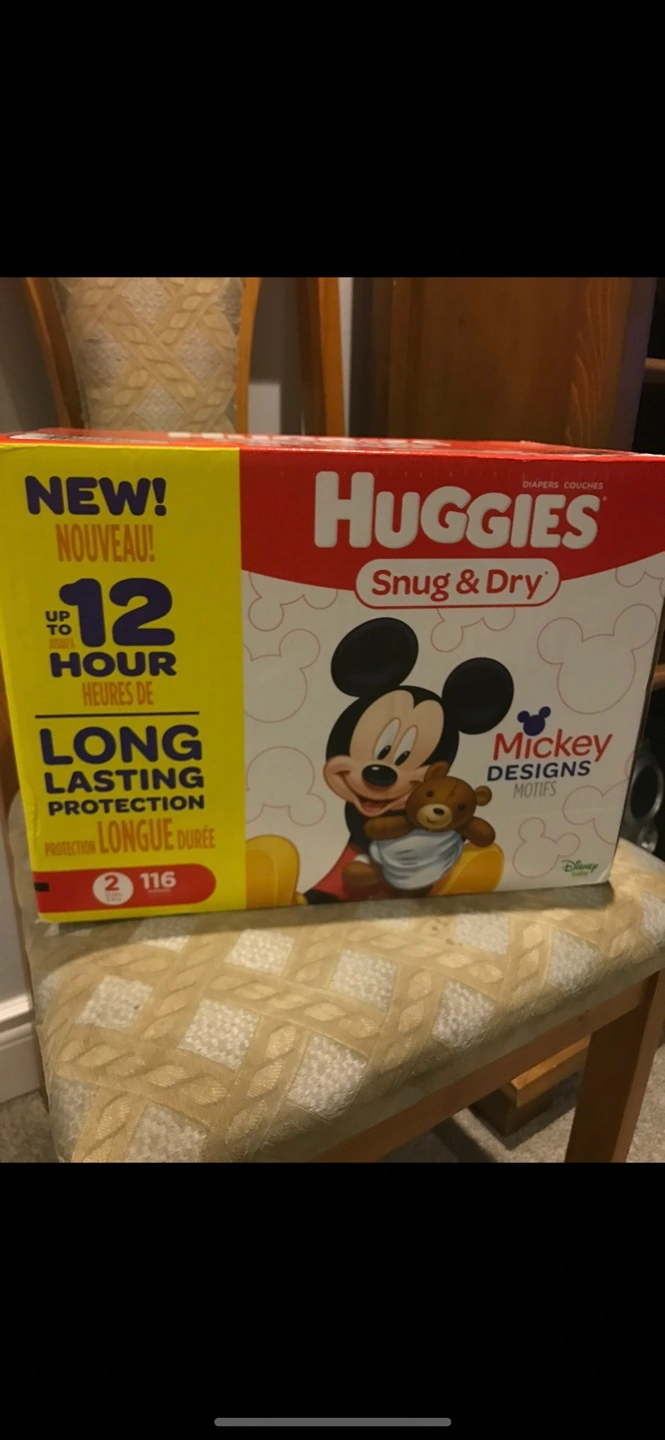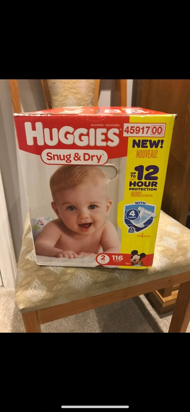 376New box of Huggies Snug & Dry diapers, size 2. Mickey Mouse designs. 116 diapers in total Smoke free pet free home Pick up can be Rathburn and the west mall area Or Symington and DuPont