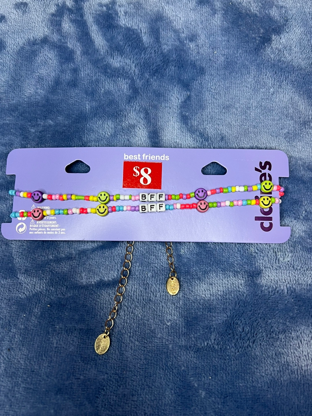 Three beaded bracelets with smiley faces and a BFF charm. Gold chain included.
