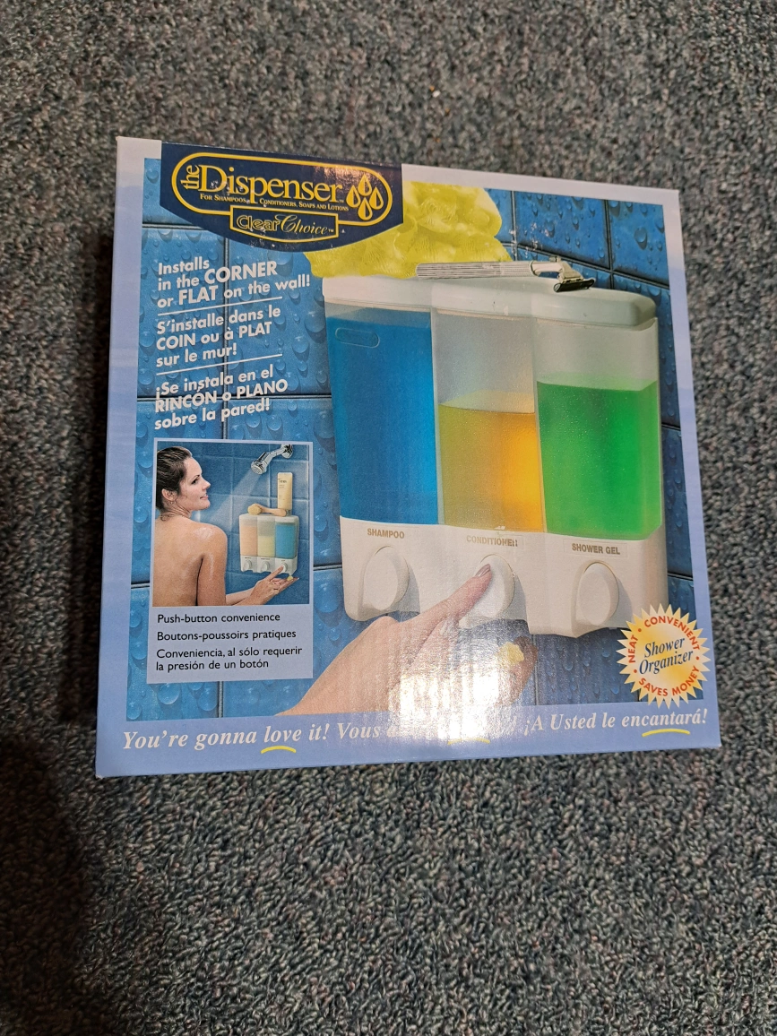Three-bottle shower dispenser with push-button dispensing. Installs on a corner or flat surface. Might need to replace Silicon Tube (Reflected in price).
