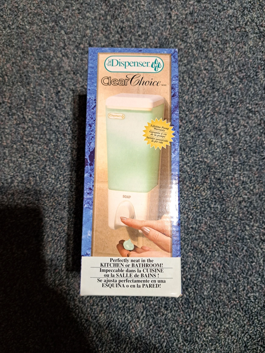 Soap dispenser, brand new in box. Fits perfectly in the kitchen or bathroom. Might need to.replace tube of Silicon.