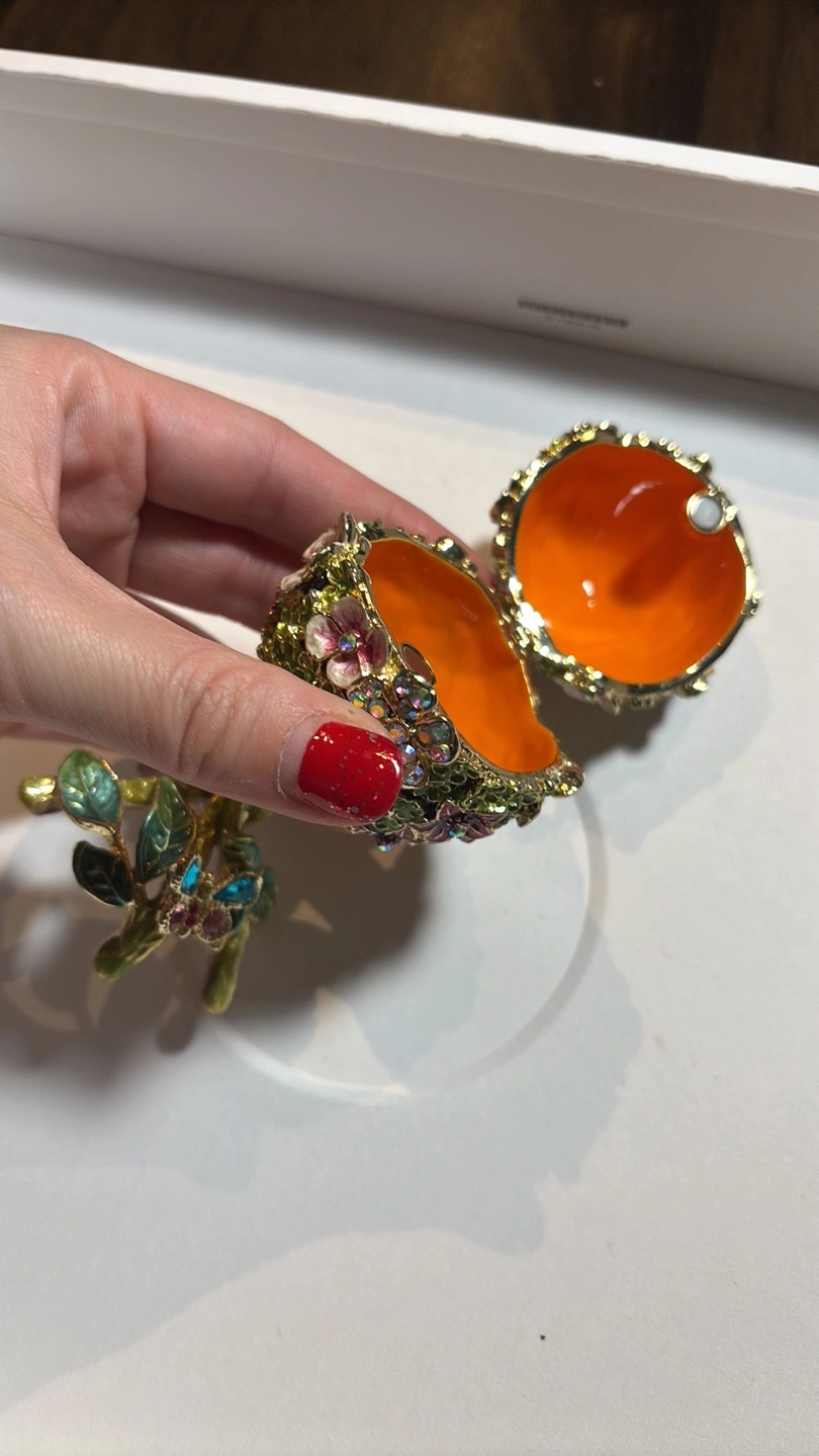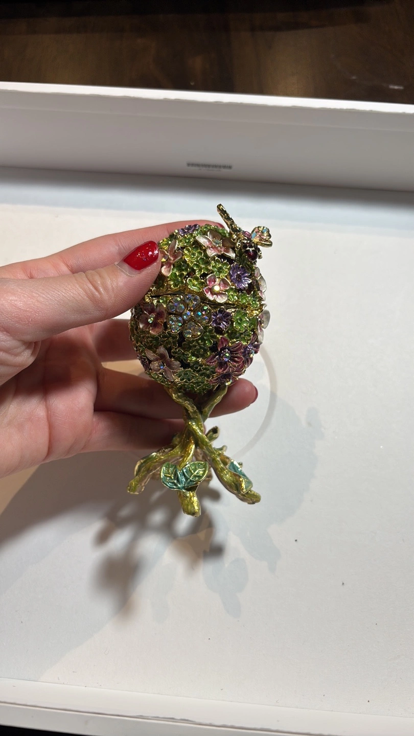 272Small trinket box with green floral design. Features a butterfly on top and stands on a branch-like base. Interior is orange.