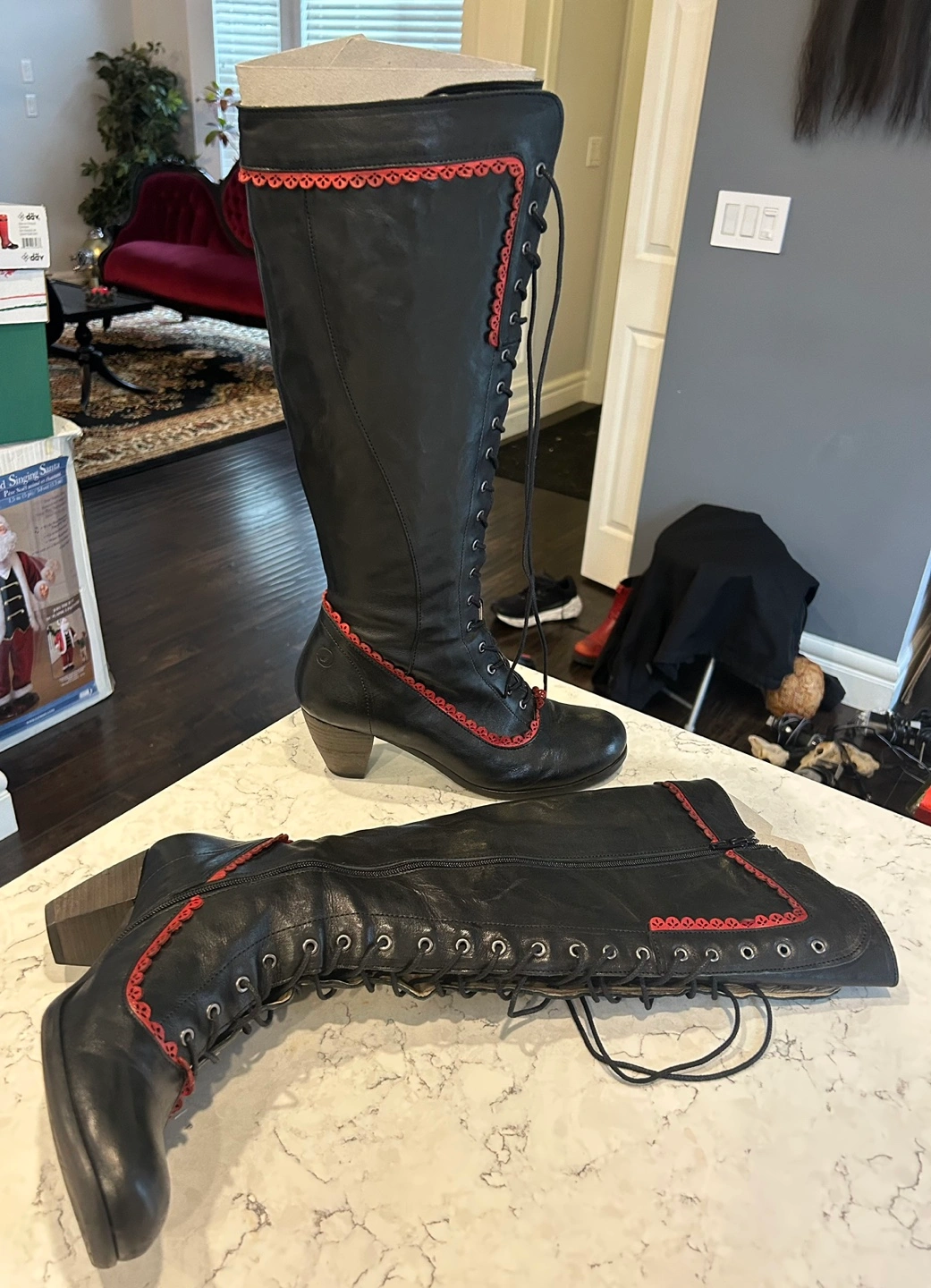 Black leather knee high boots with red trim. Lace up front with zipper on the back. Low heel. Size 39