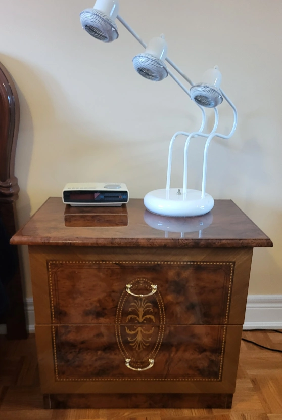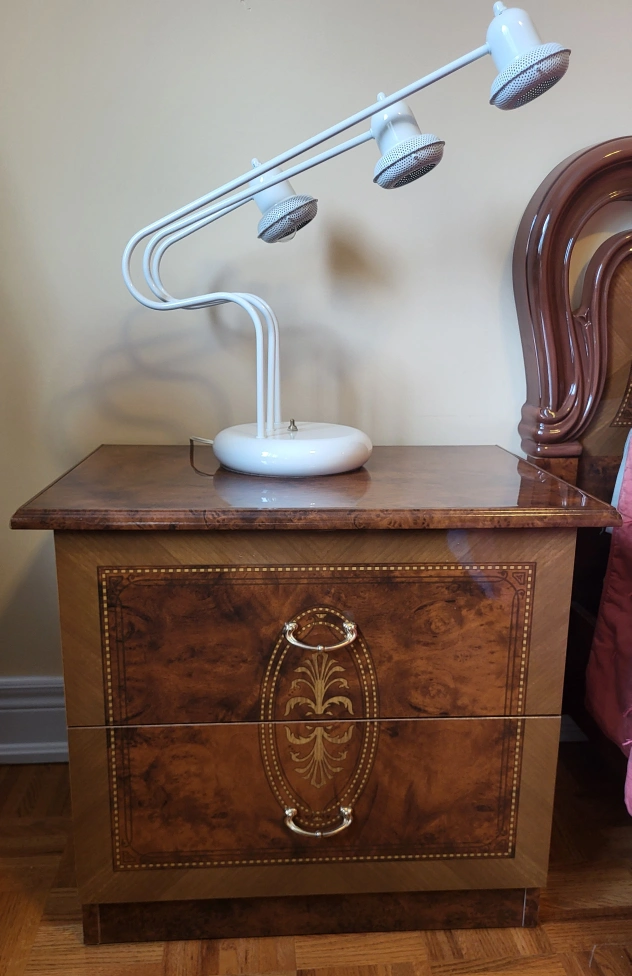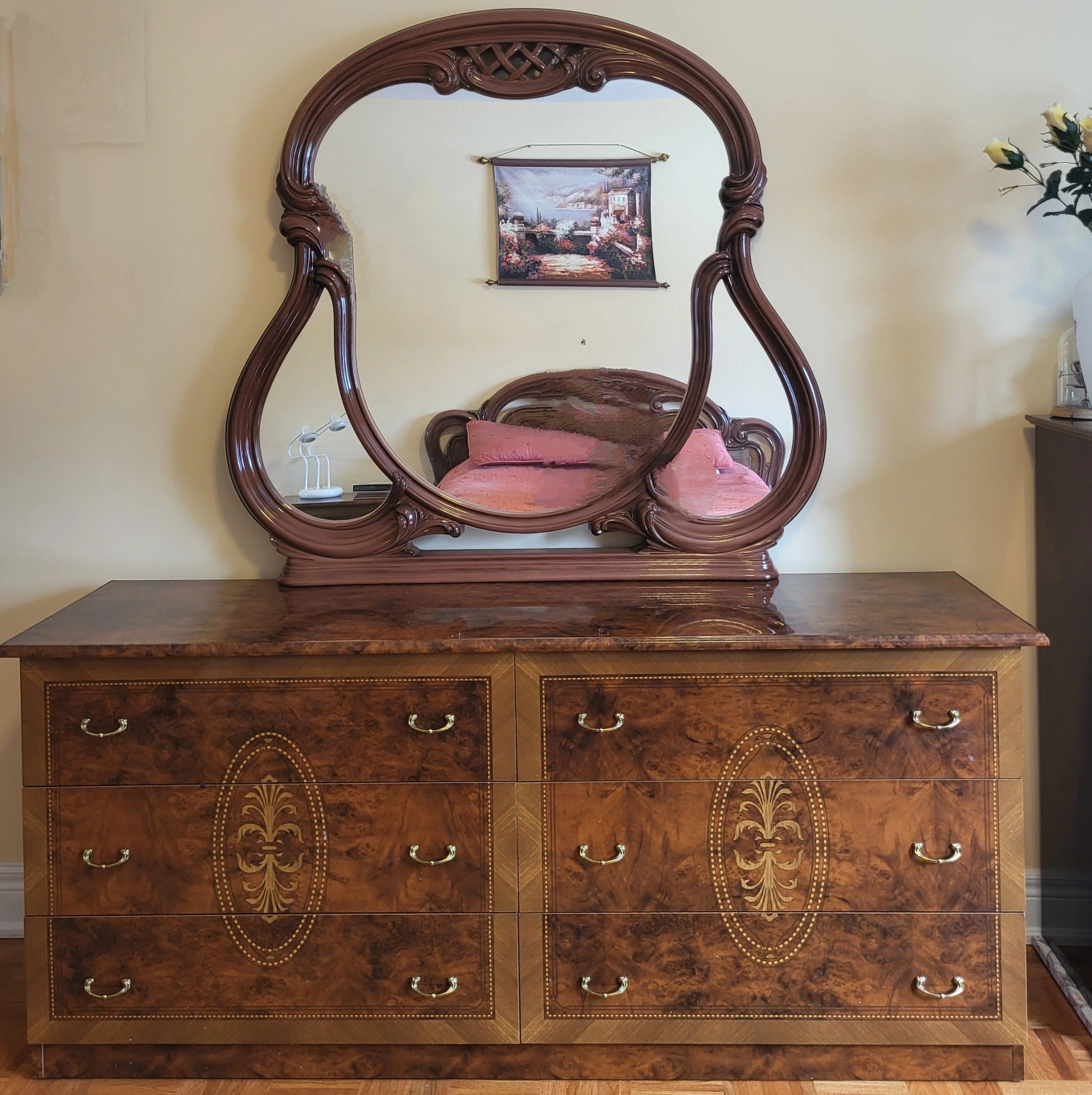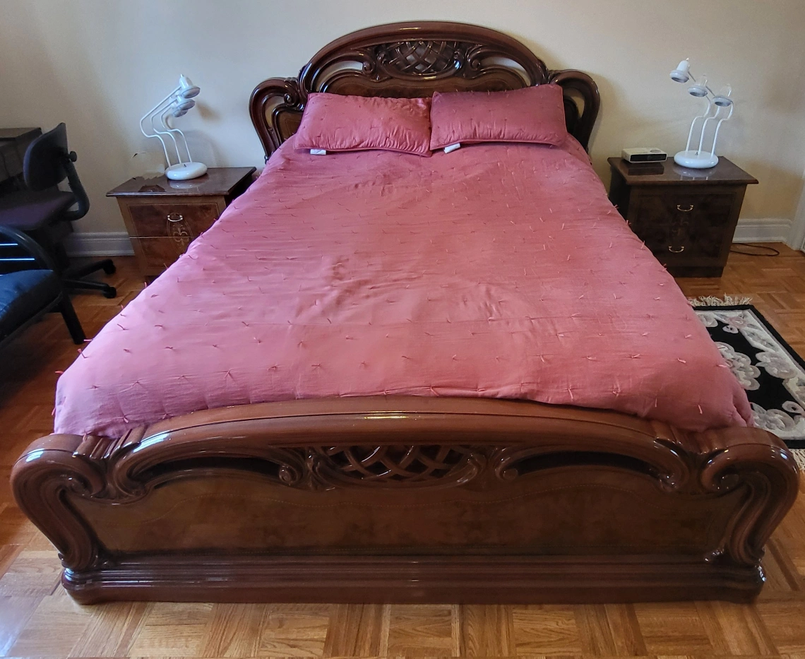 Queen size bedroom set. Includes headboard, footboard, two nightstands, dresser and mirror and pillowtop queen mattress & box spring. All pieces have intricate details and a wood finish. In great condition. Pick up only.