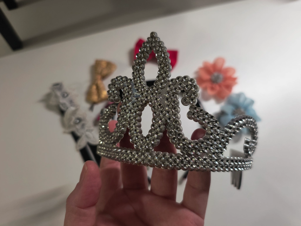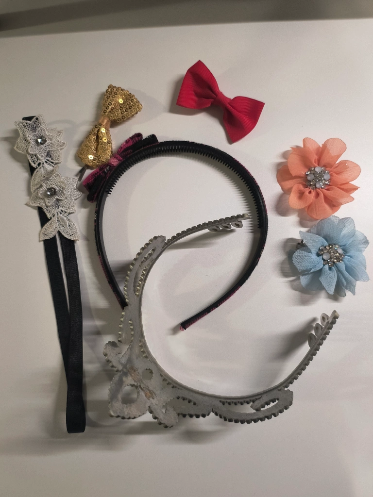 Set of hair accessories, including a silver crown, two headbands, and various clips/bows. Perfect for dress-up.