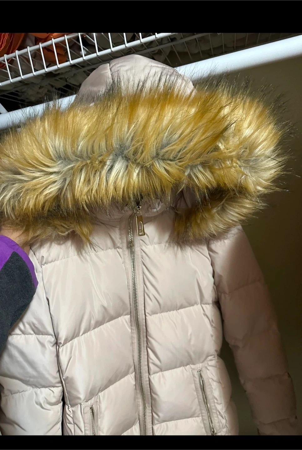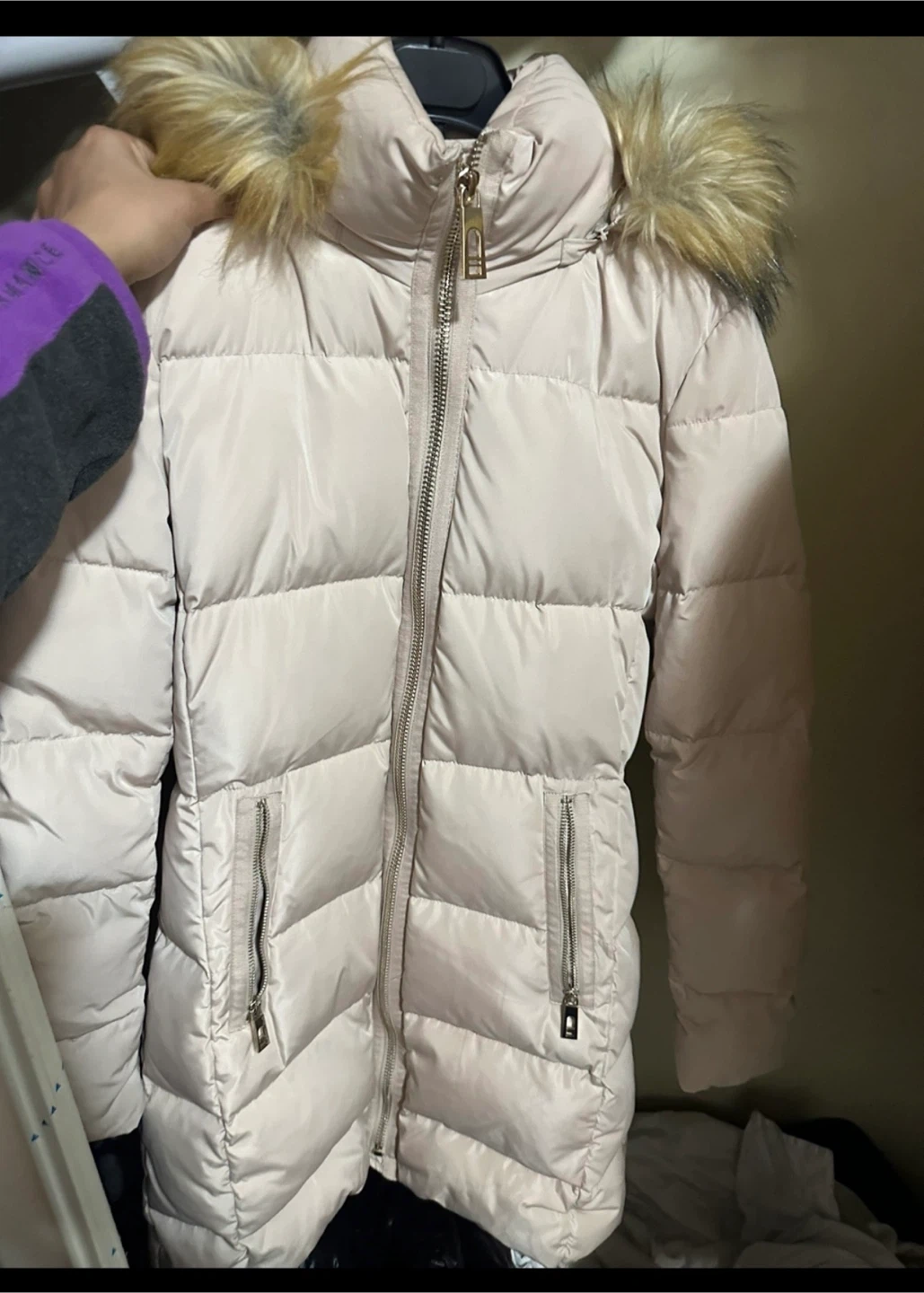Snuggle up in style with this women's XS Ivanka Trump puffer coat! In excellent condition, this jacket is perfect for chilly days and features a stylish design with a faux fur-trimmed hood and functional pockets.