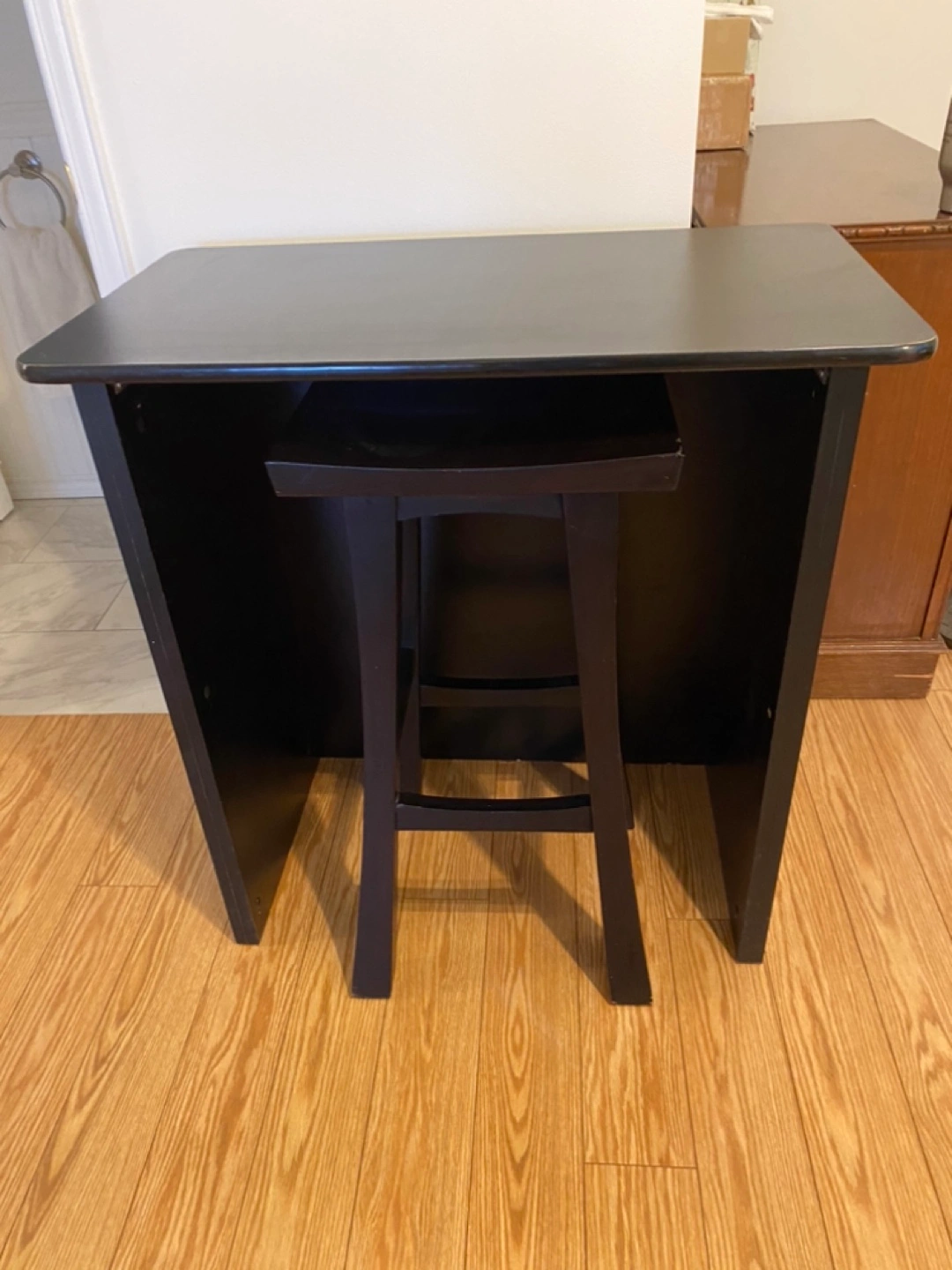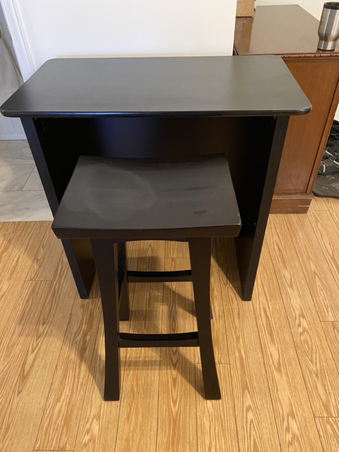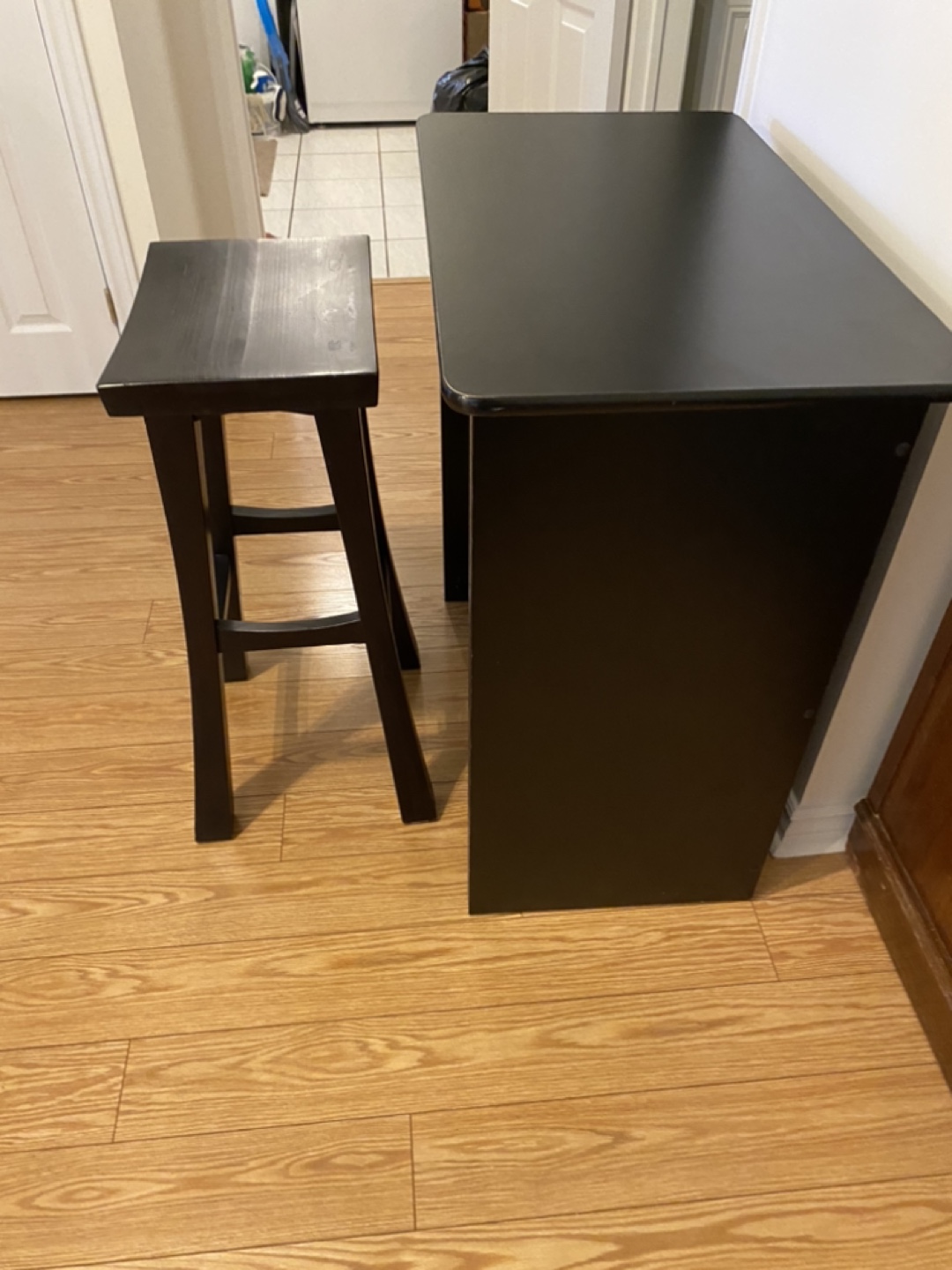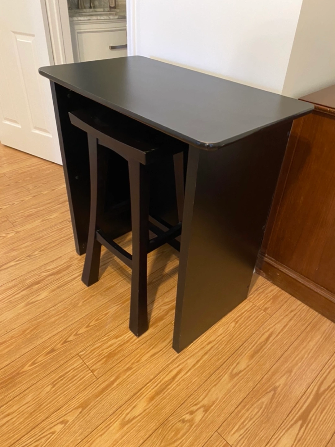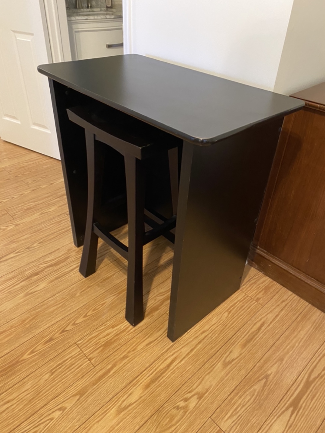 Black kitchen table with a matching stool. Small table, good for a small space.