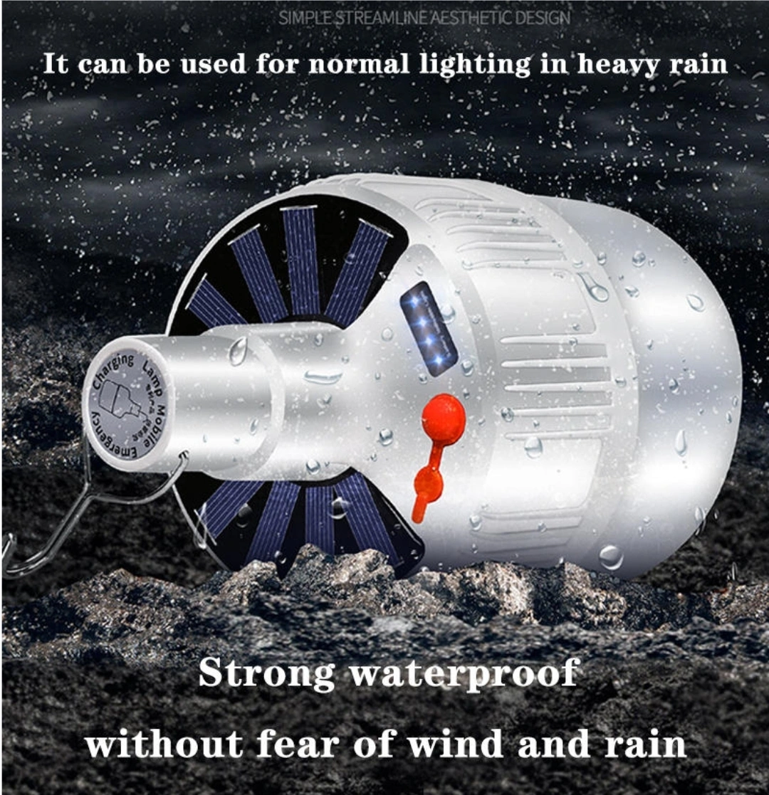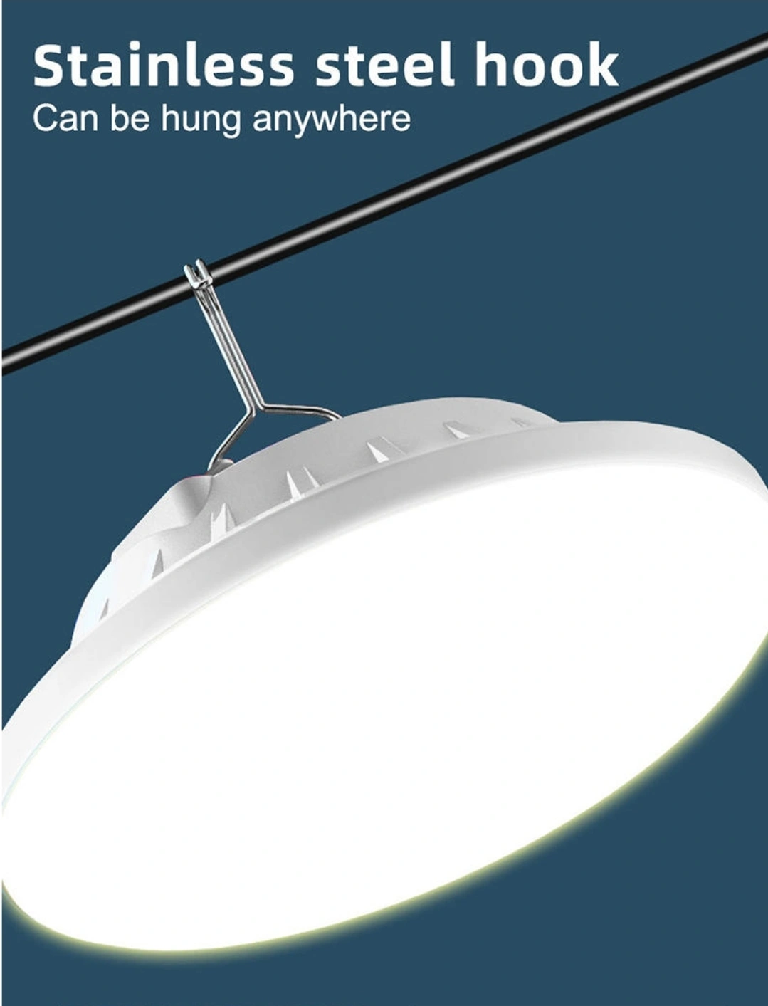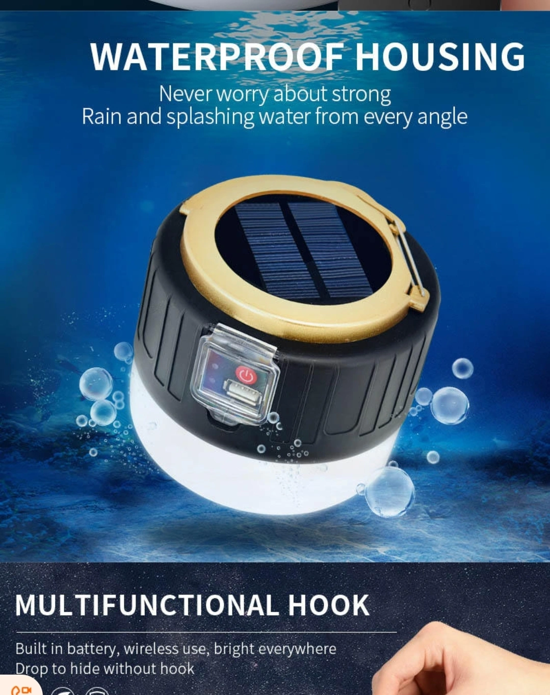 Waterproof and portable camping light with a built-in battery, remote control and USB charging. Can be hung with the hook or used as a standalone light.