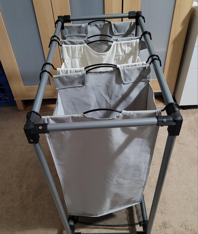 Three-bag laundry hamper with rolling base. Includes grey fabric bags.