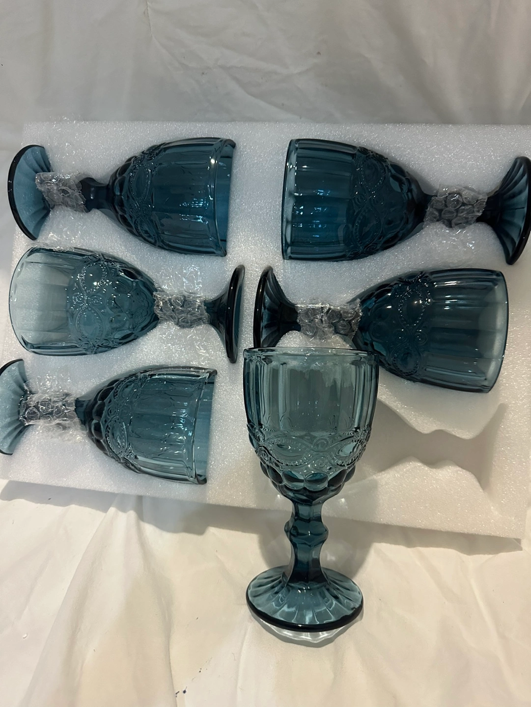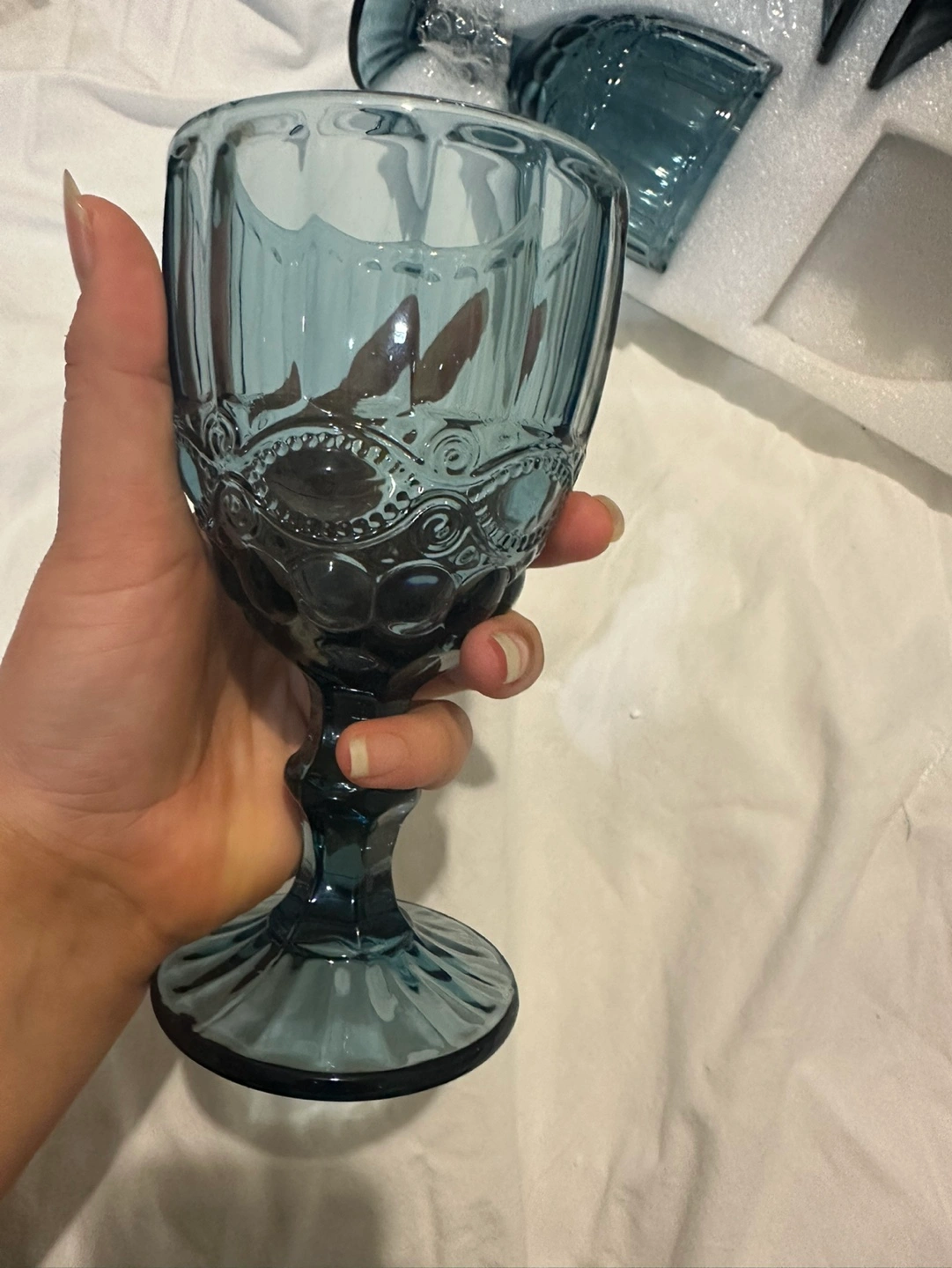 Vintage Wine Glasses Set of 6, 10 Ounces Colored Glass Water Goblets, Unique Embossed Pattern High Clear Stemmed Glassware Wedding Party Bar Glass Drinking Cups Floral Blue