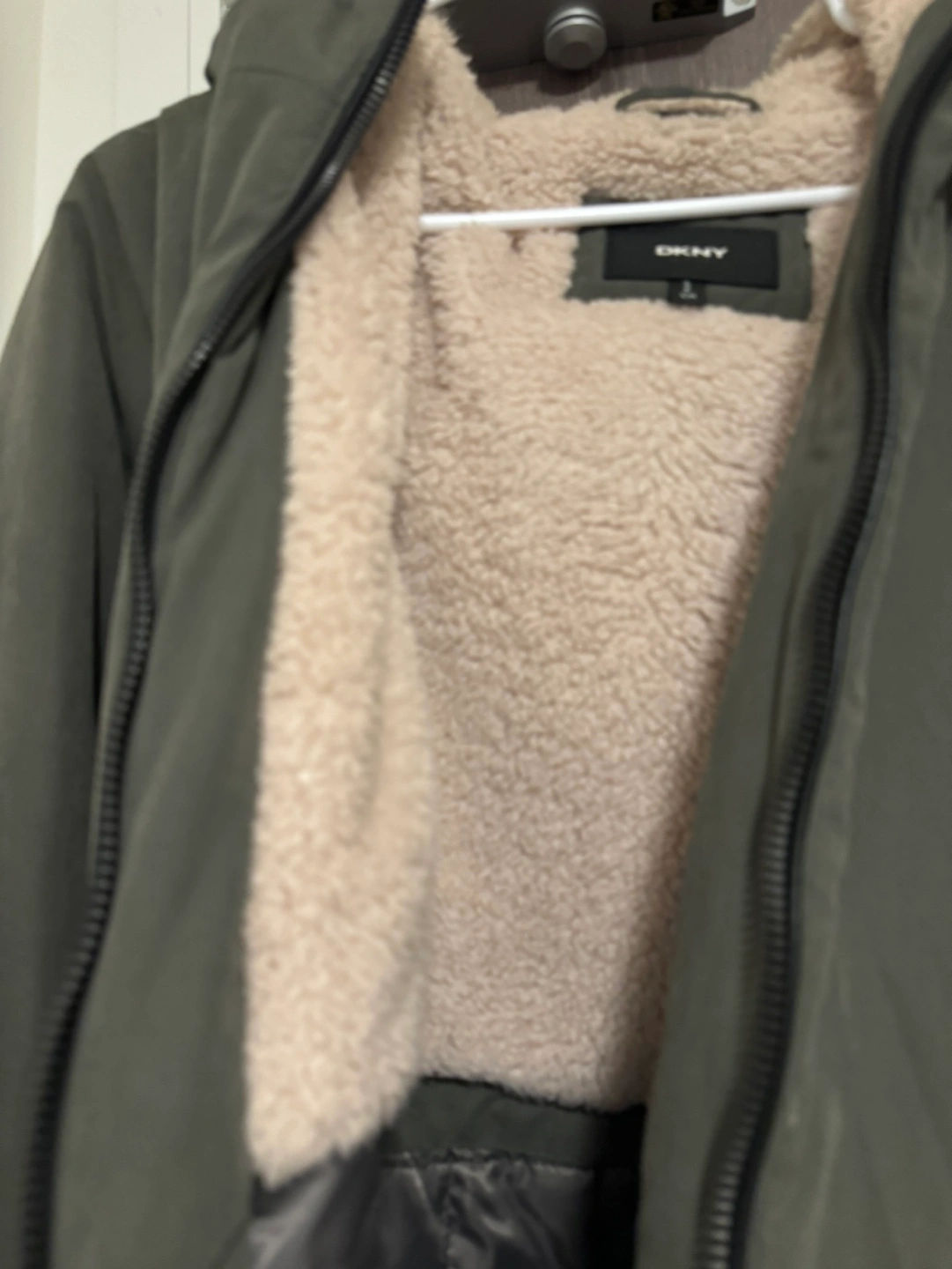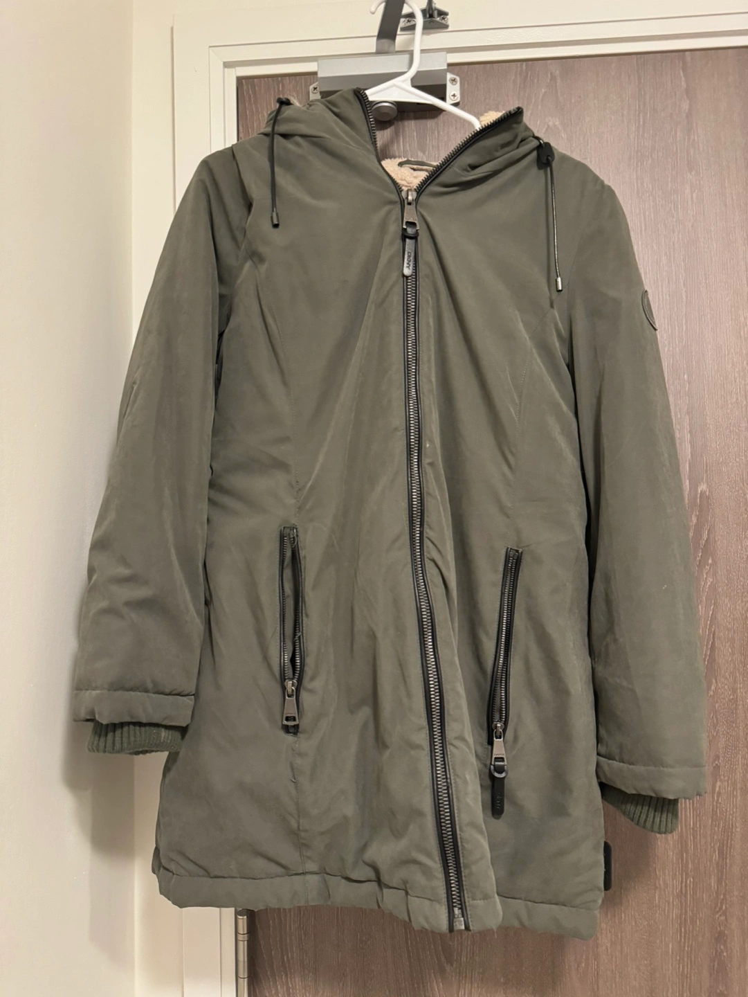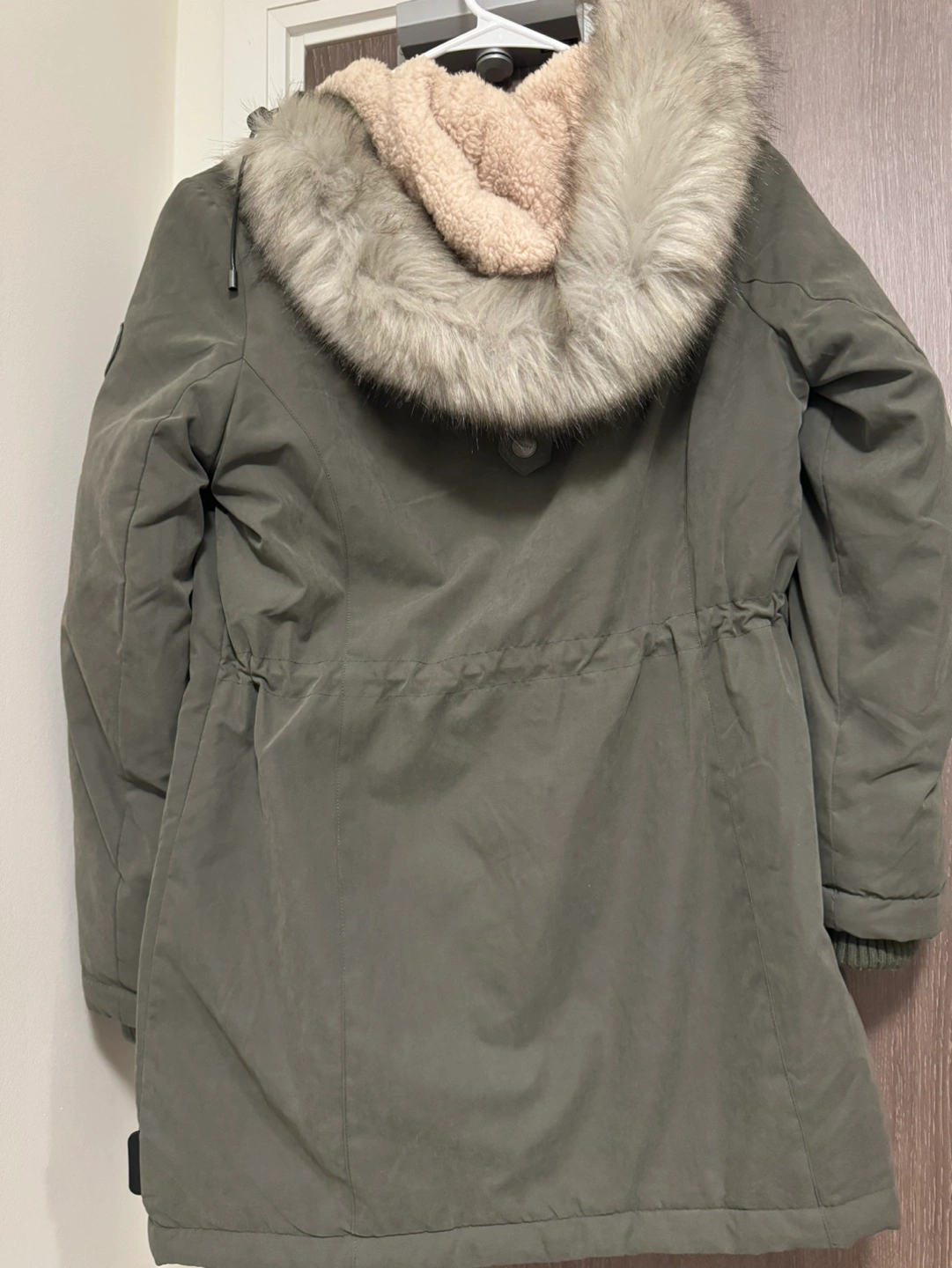 172Green coat with fur hood, zip closure and pockets. Lined with faux fur.