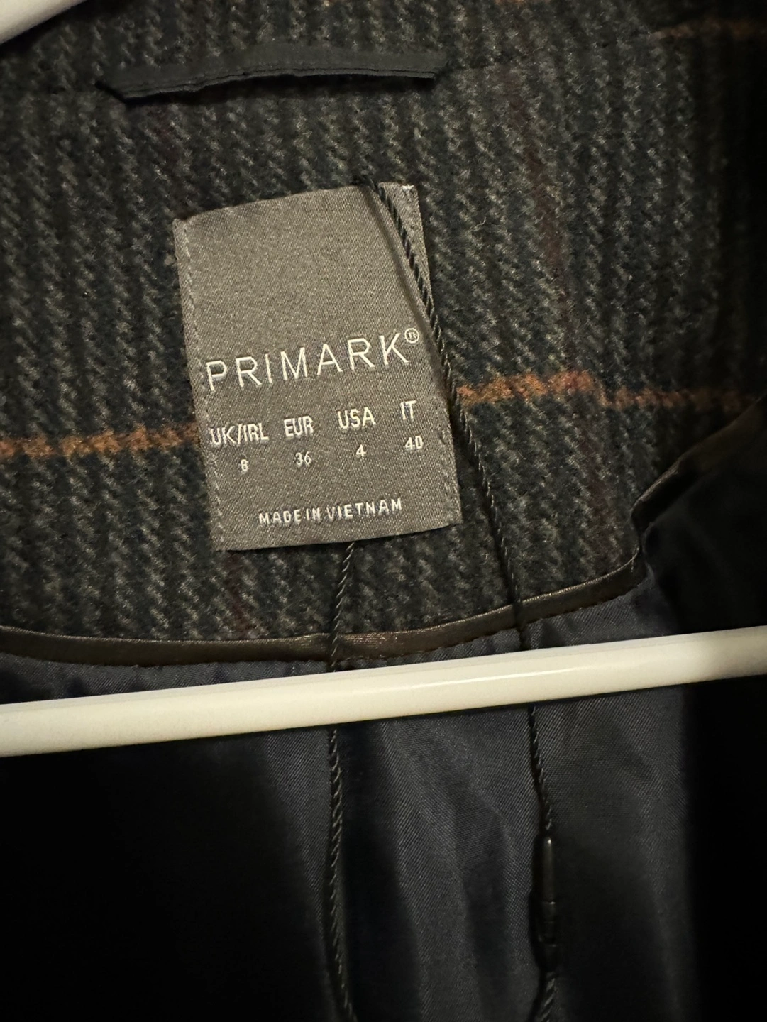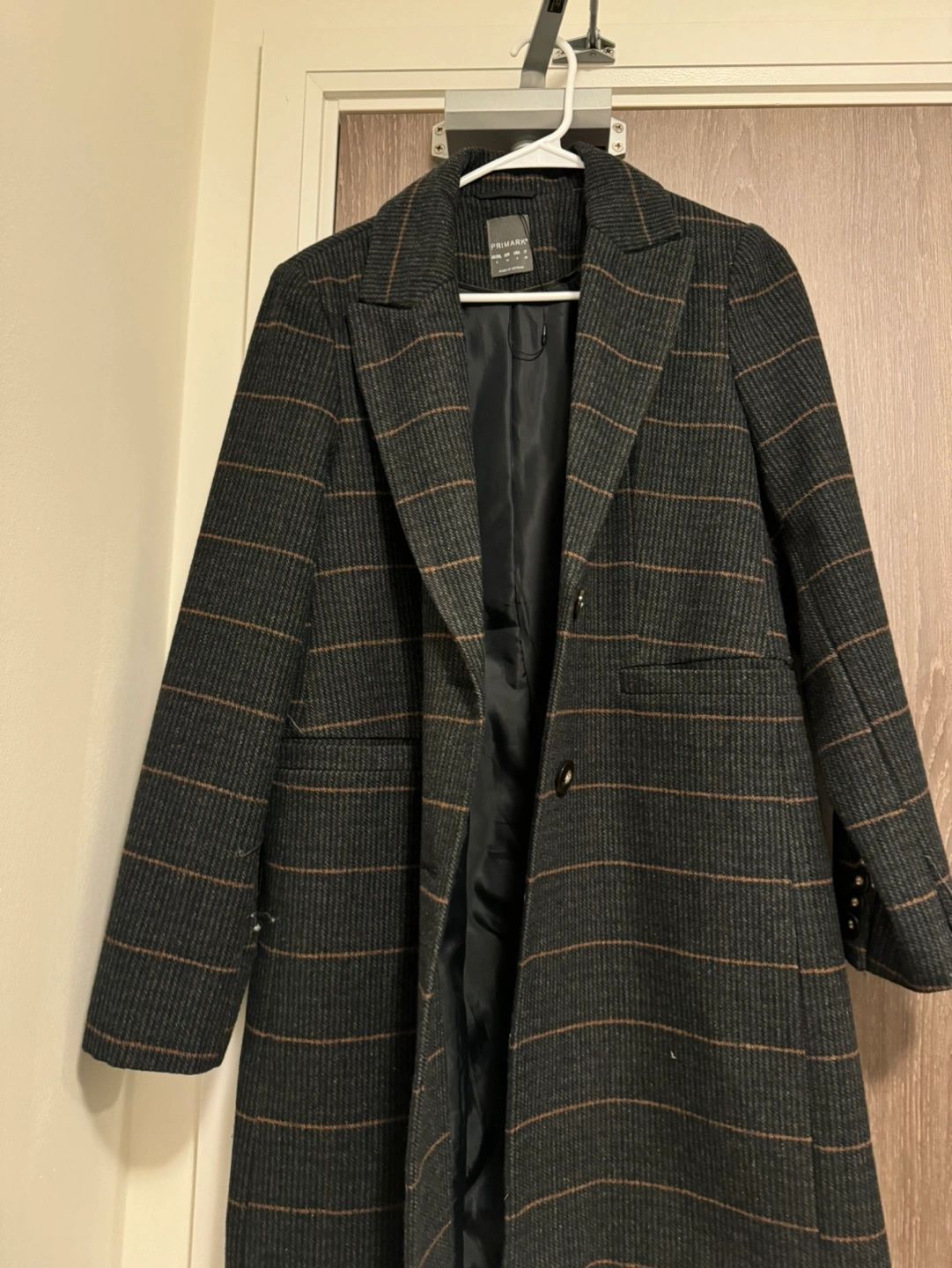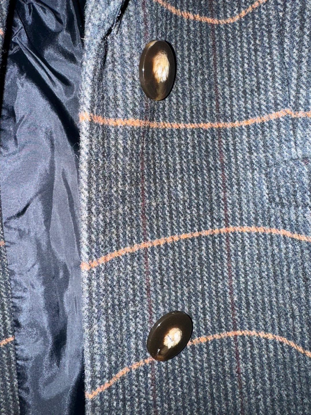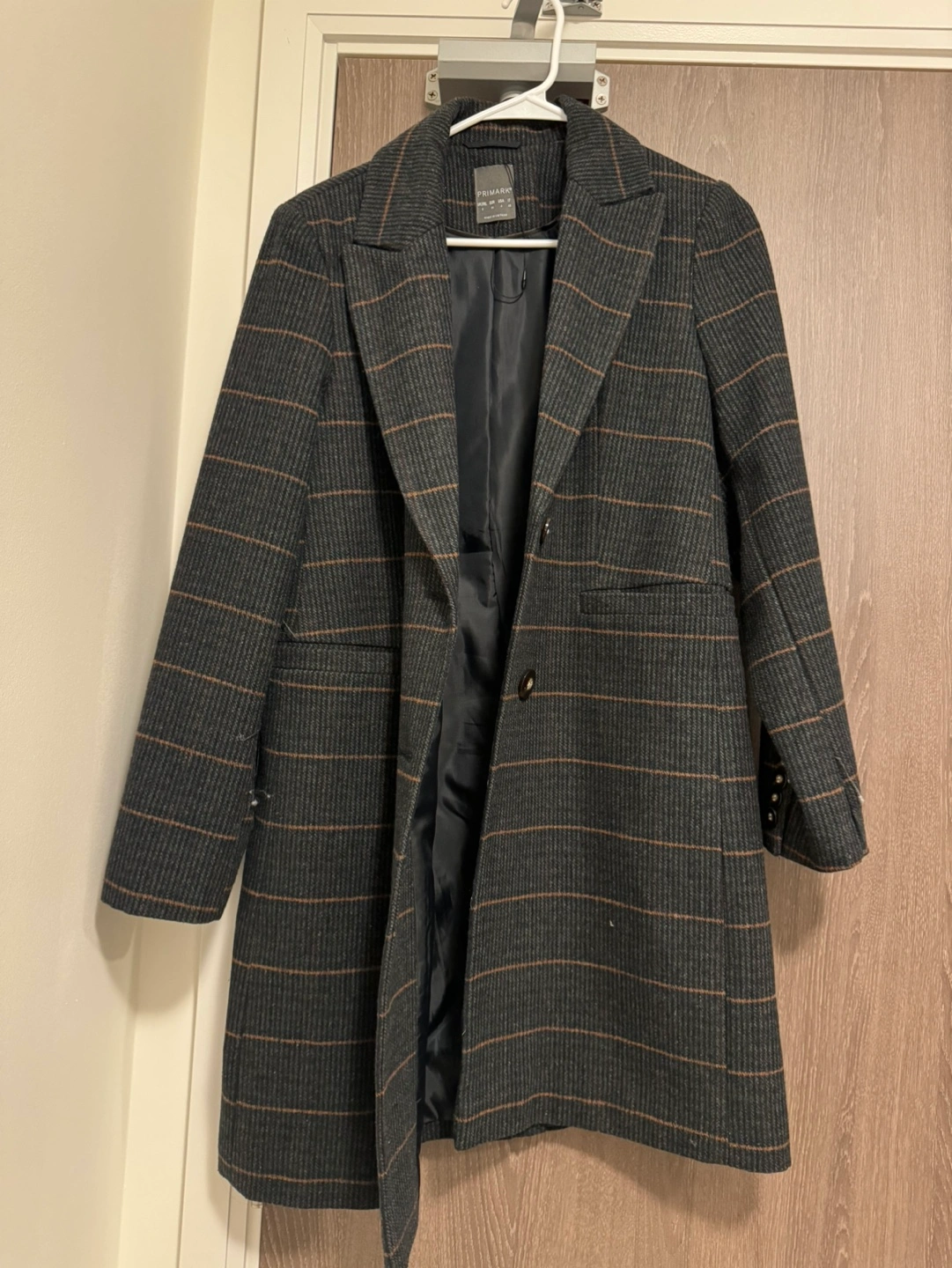 172Grey and brown plaid coat. Long sleeves, button closure. Has pockets.