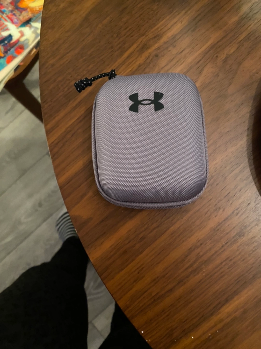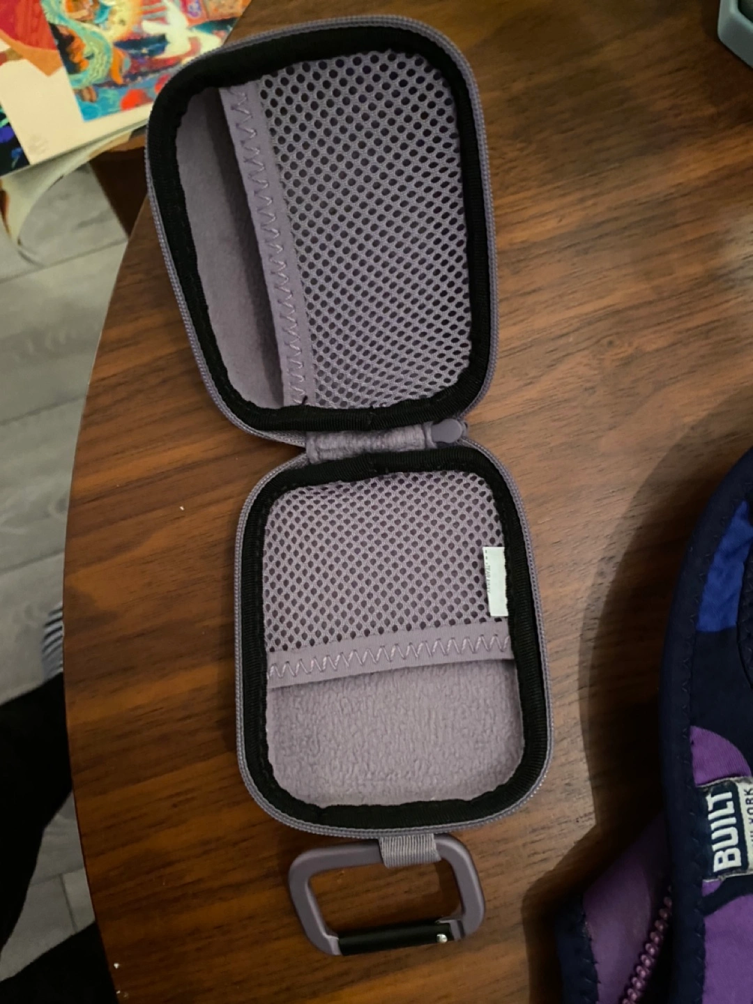 Small purple carrying case with a zipper closure. Has a carabiner clip. The inside is lined with a soft fabric and a mesh pocket.