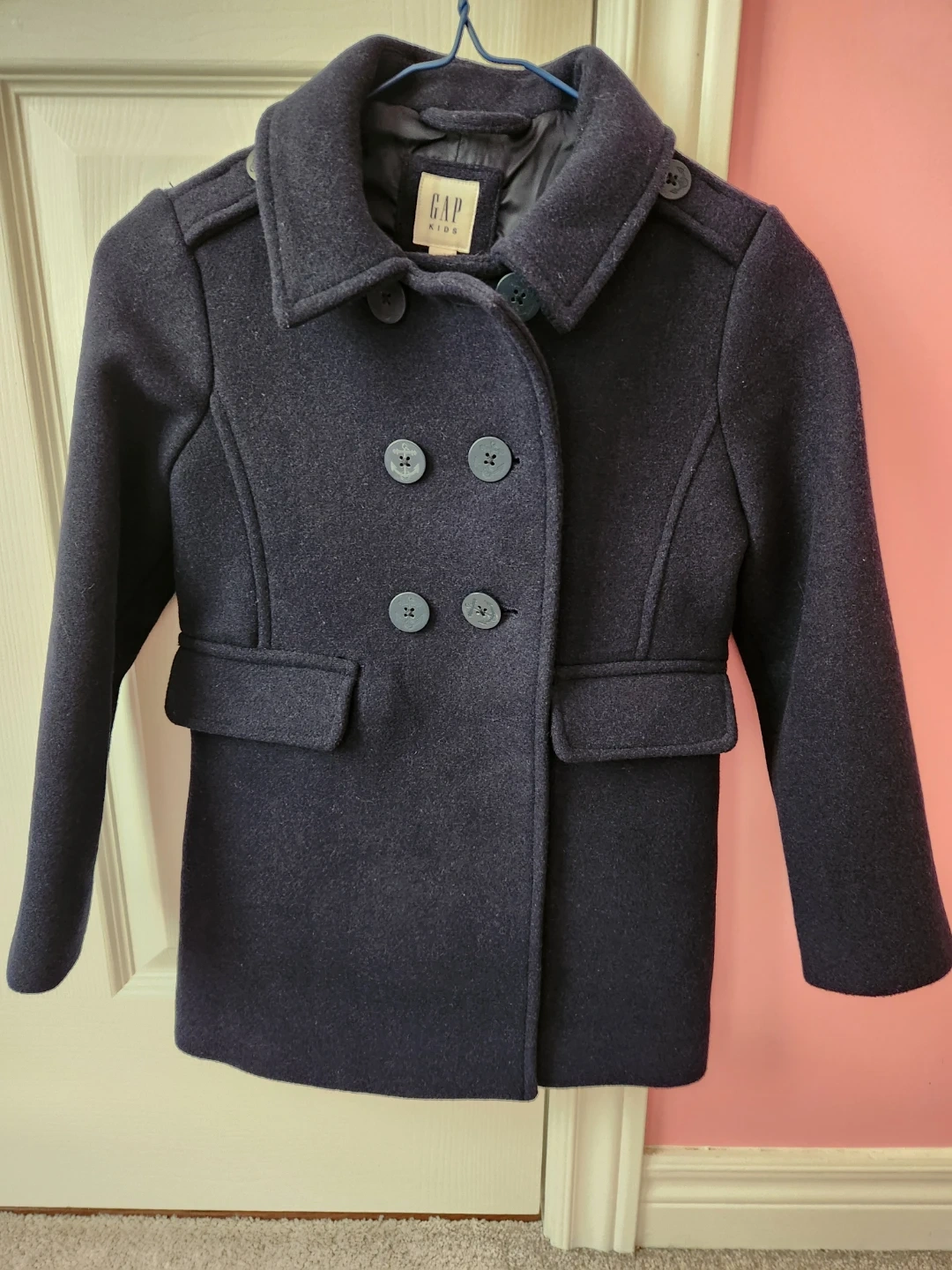 This is a navy blue GAP Kids double-breasted coat. It's a wool blend with button detailing and two front pockets. A warm coat for cooler weather!