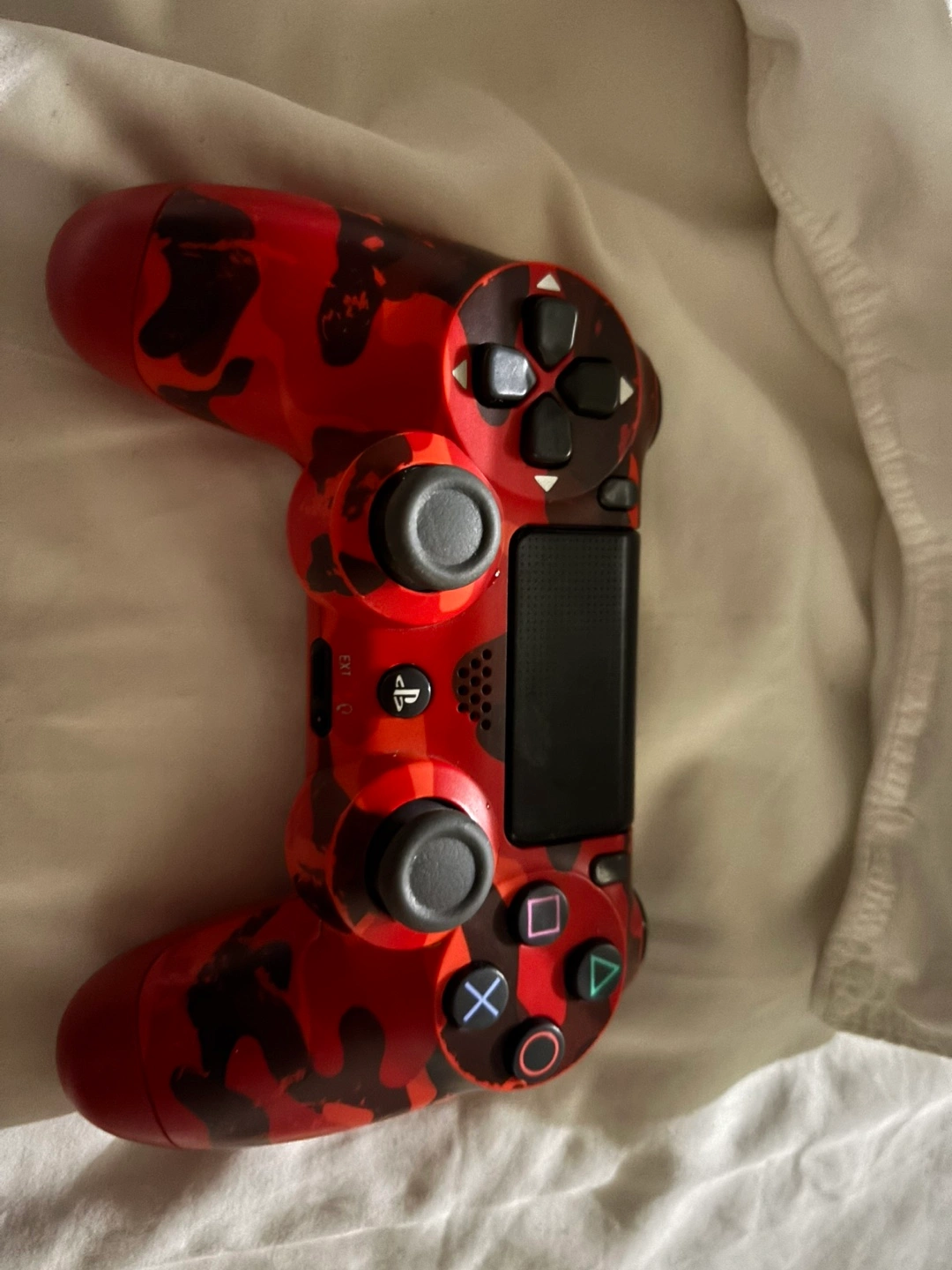 Red camouflage PS4 controller. In good condition. Bought recently, never used it much cause it wasn’t bought to be played on the PS4, so it’s basically brand new and you’d be able to tell by simply looking at it