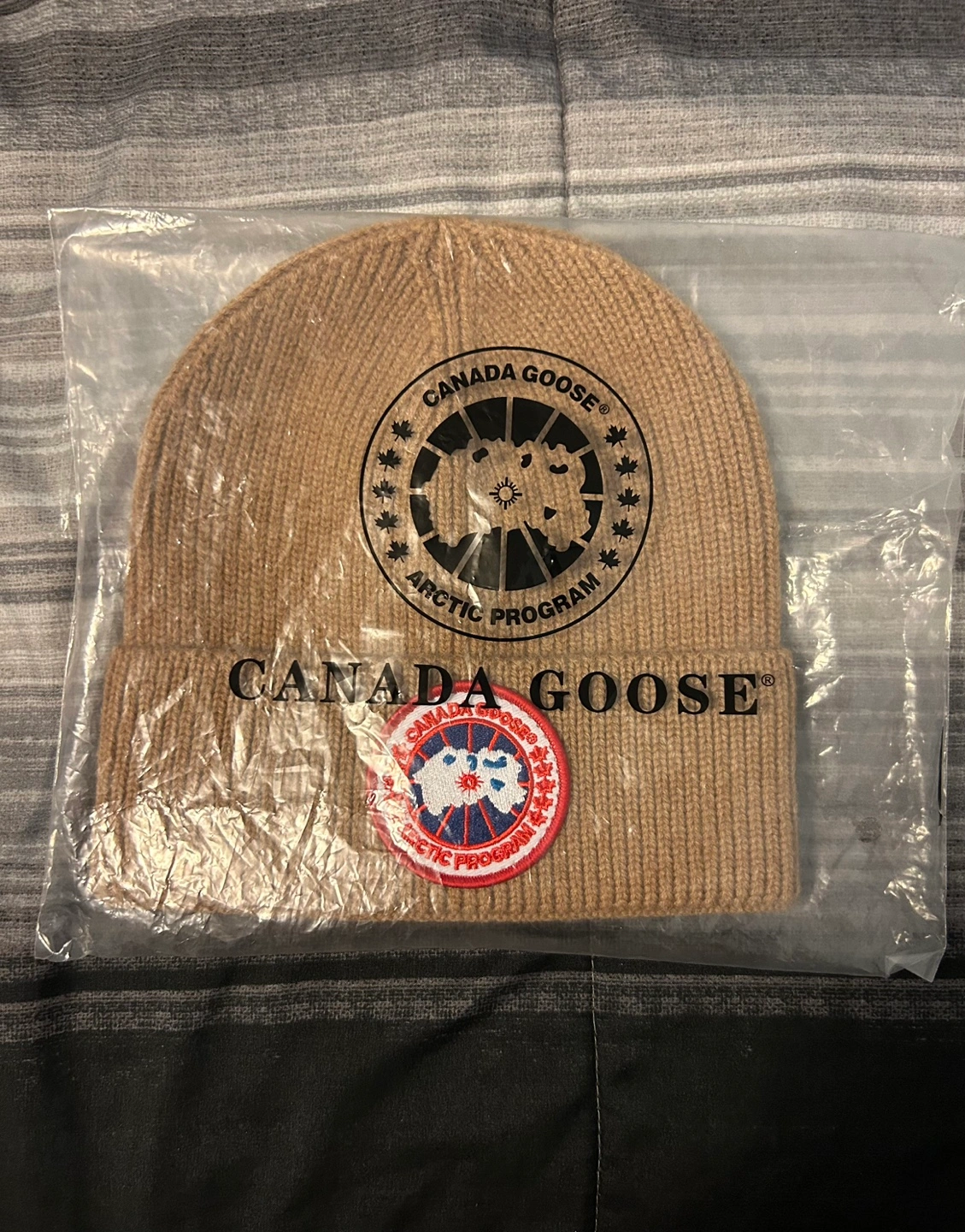 126Tan knitted beanie with Canada Goose logo patch. 1:1 rep contact for more info