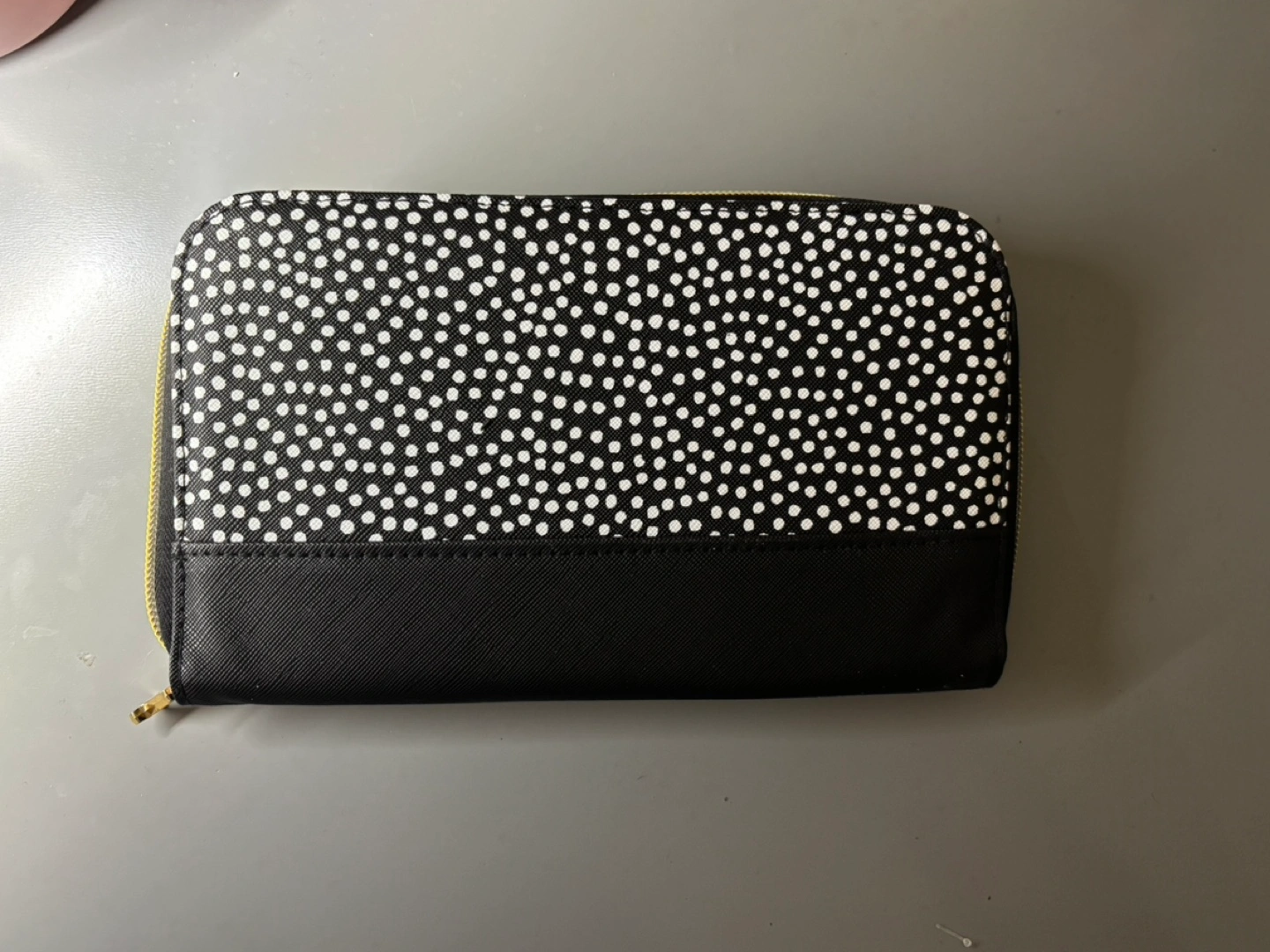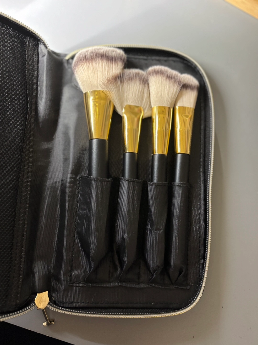 Makeup brush case with a polka dot design. Includes 4 makeup brushes. Has a zipper closure and an inner mesh pocket.