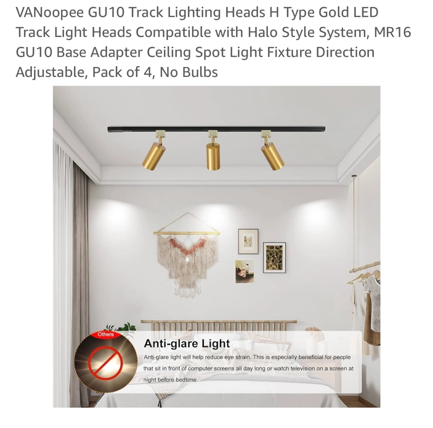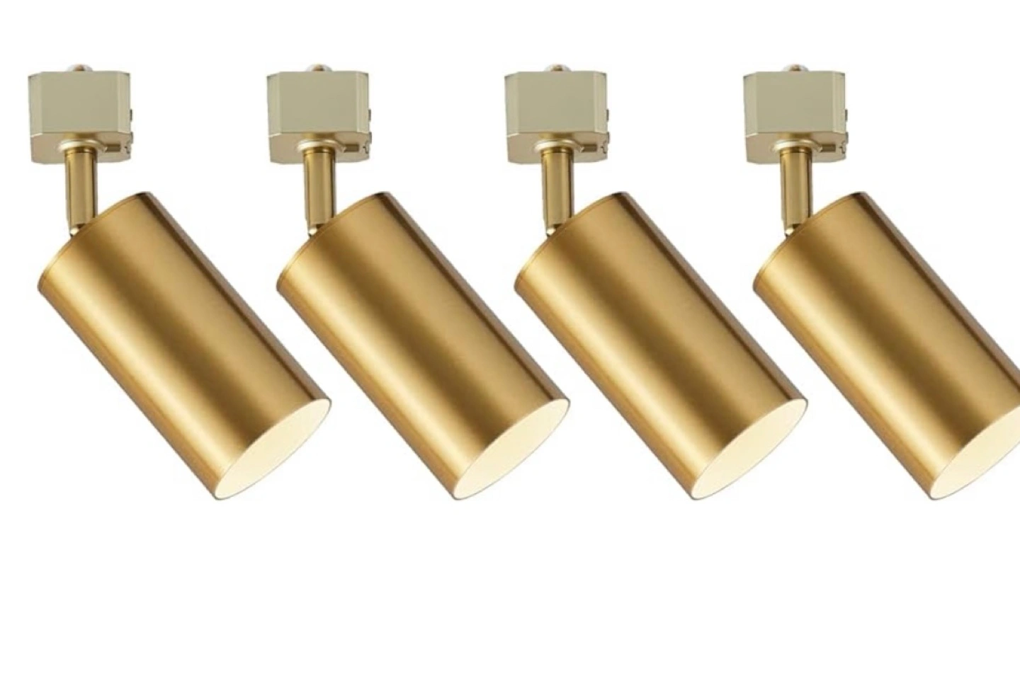Gold track light heads, compatible with Halo style track lighting system, MR16 GU10 base adapter. Direction adjustable. Pack of 4, no bulbs included.