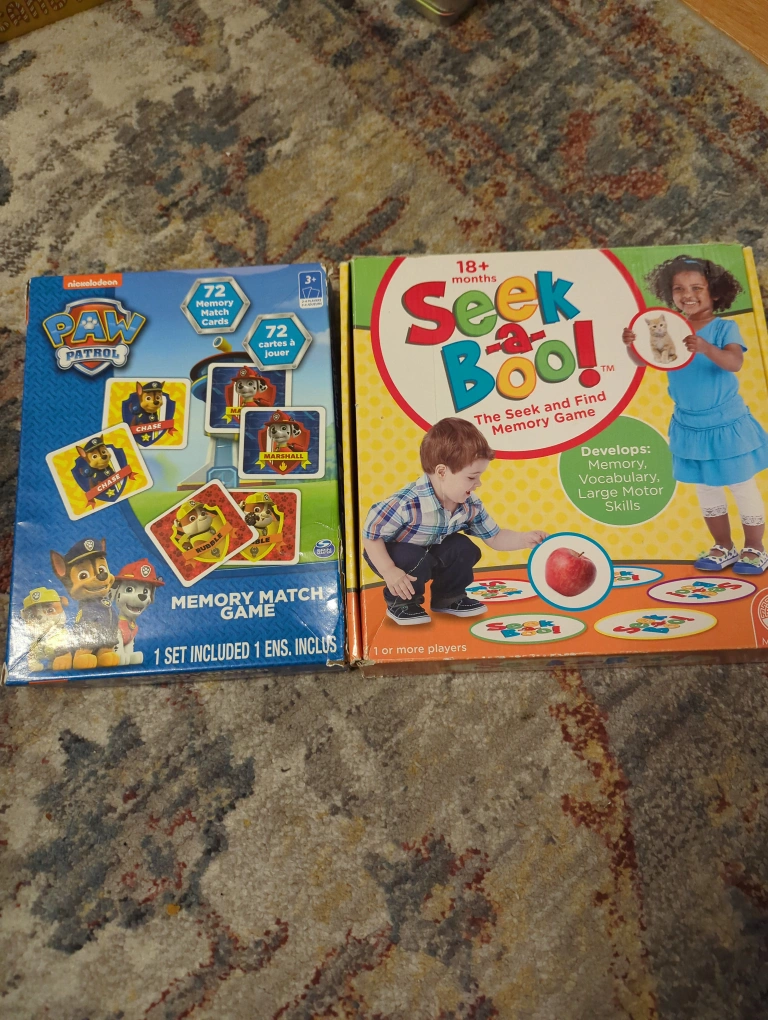 Two memory match games. Paw Patrol memory match game and Seek-a-Boo memory game.