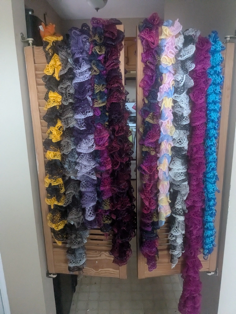 knitted sassy stairs scarves in a variety of colours. Great for adding a touch of style to any outfit. $10 each hand knitted