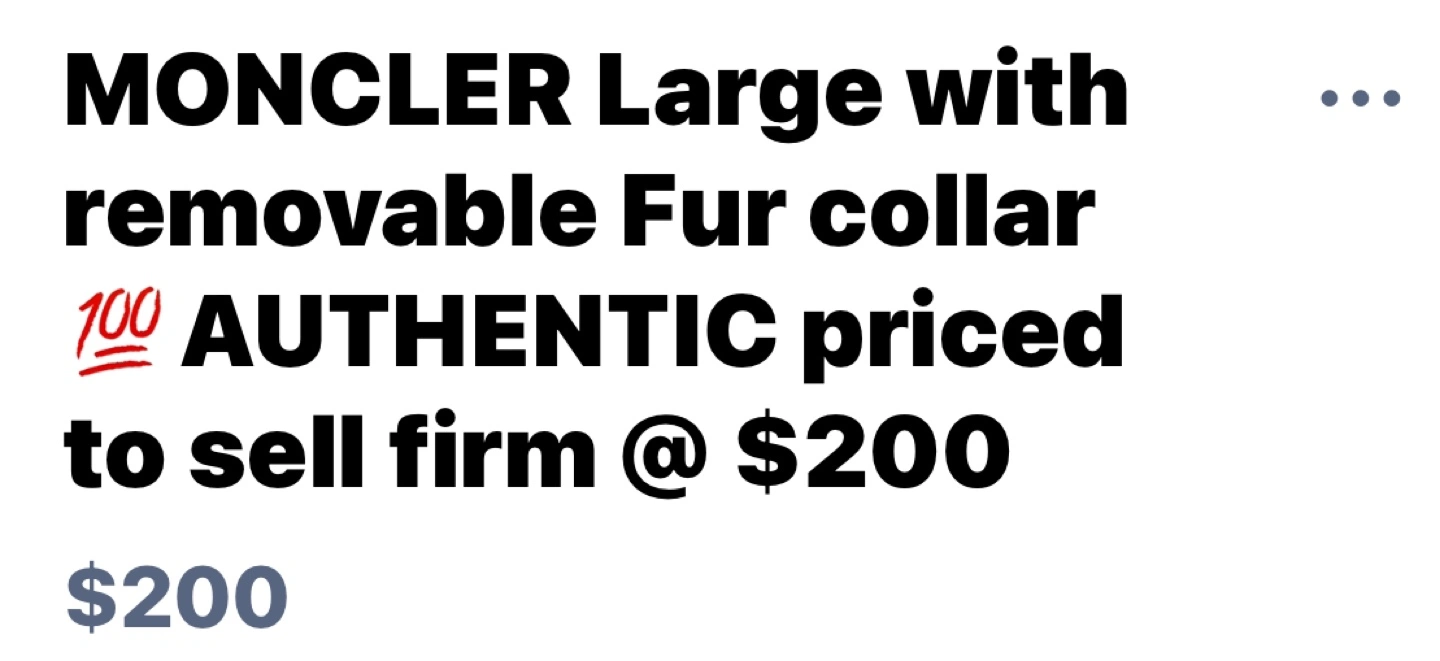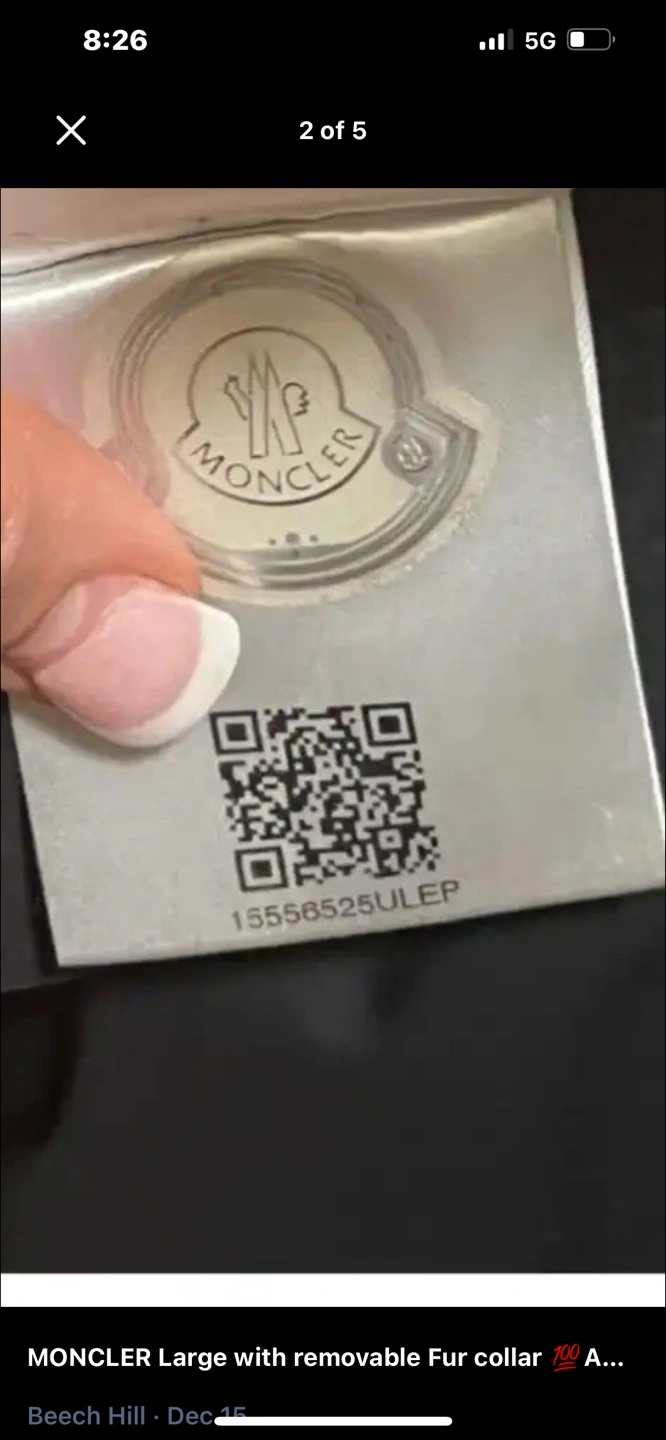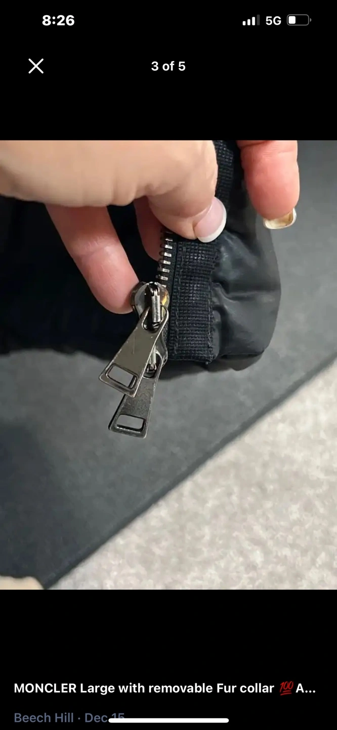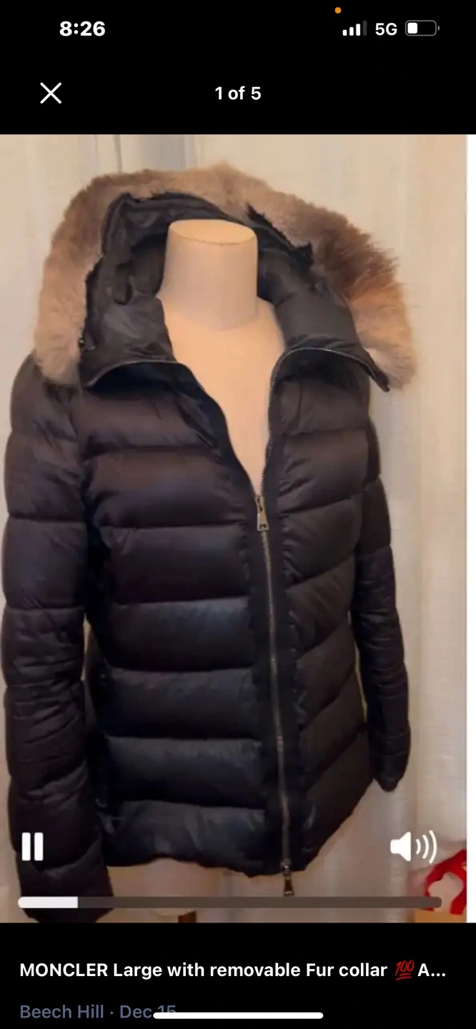 Black down jacket with removable fur collar. Size Large.Fur is worn at back and is removable It does have a missing/broken button snap on the collar fur that does not affect it. The coat comes with replacement snap button original of MONCLER. I was going to have it replaced but instead bought a new MONCLER