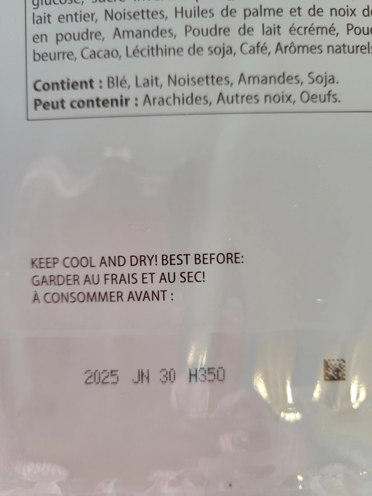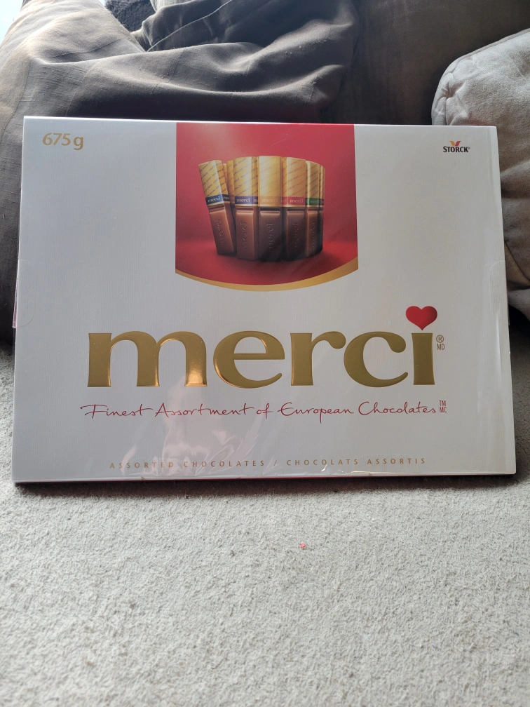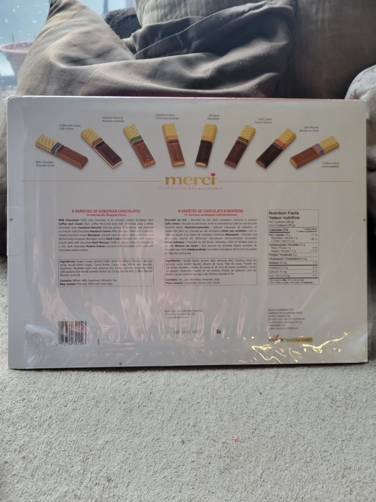 Box of assorted chocolates. 675g. Assortment includes milk chocolate, dark chocolate, coffee and cream, hazelnut, milk cream, almond, dark coffee, and marzipan.