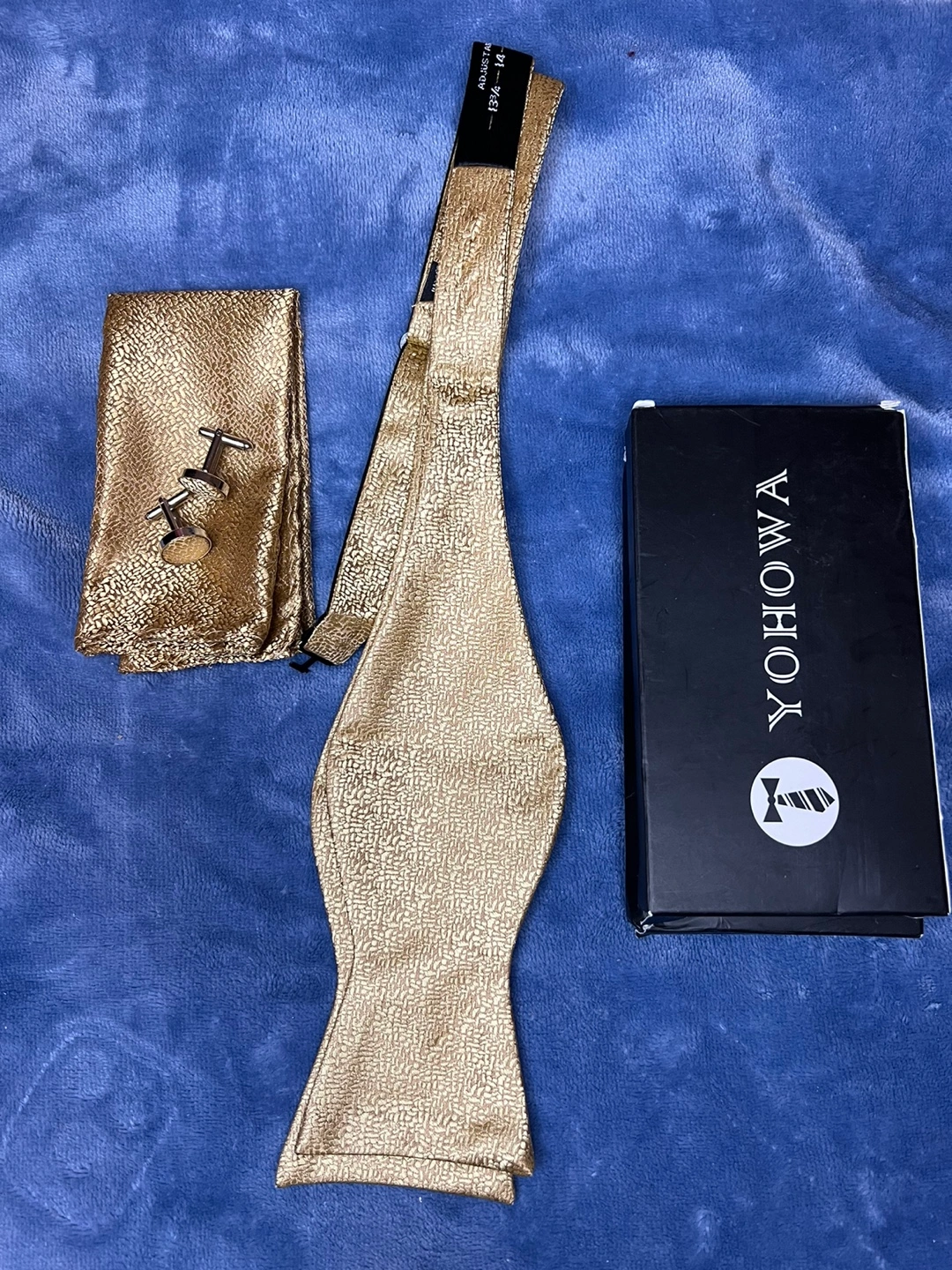 Gold bow tie with matching pocket square and cufflinks. Comes with box.