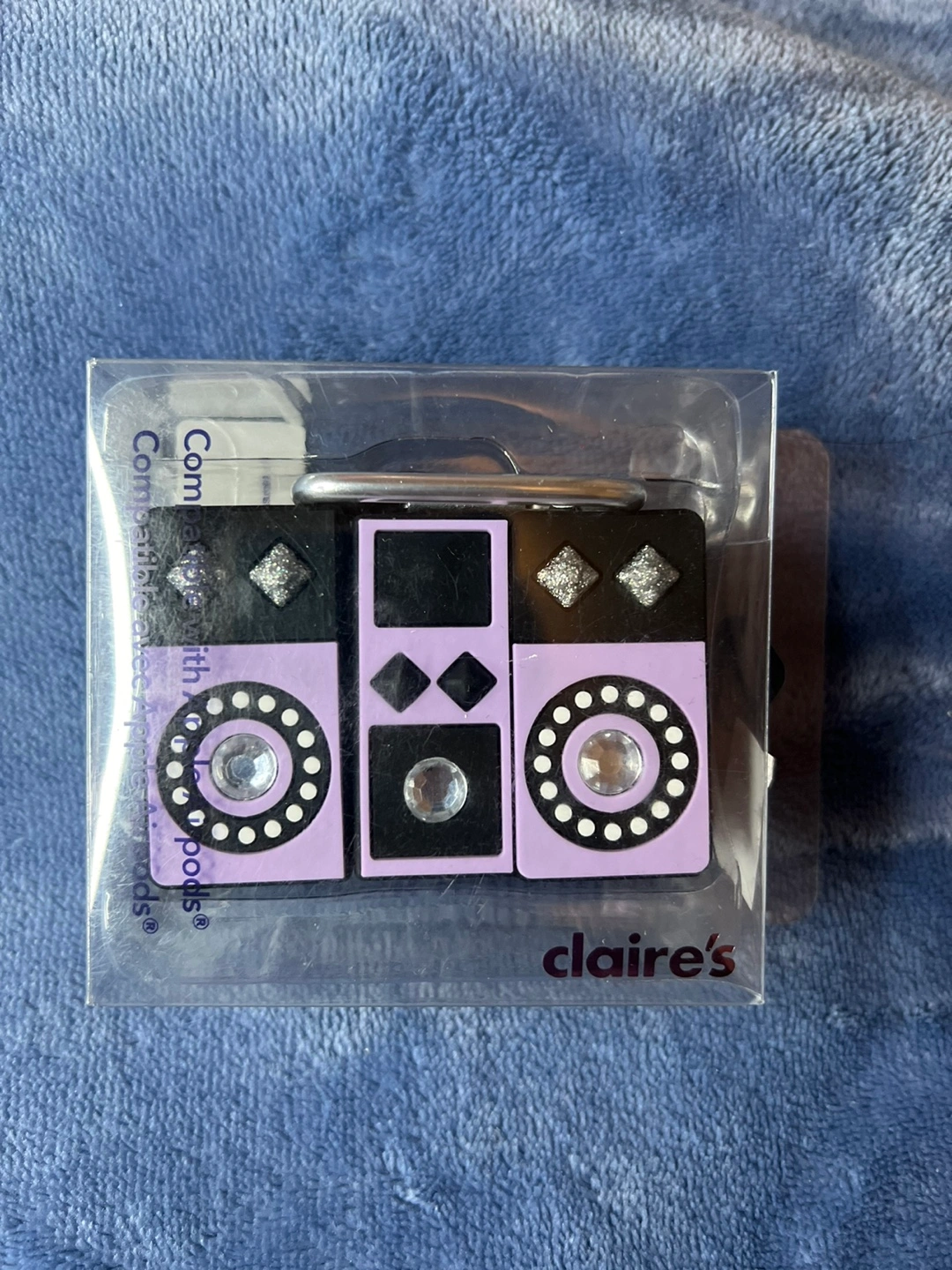 Purple and black boombox phone charm with rhinestones. Compatible with iPods.