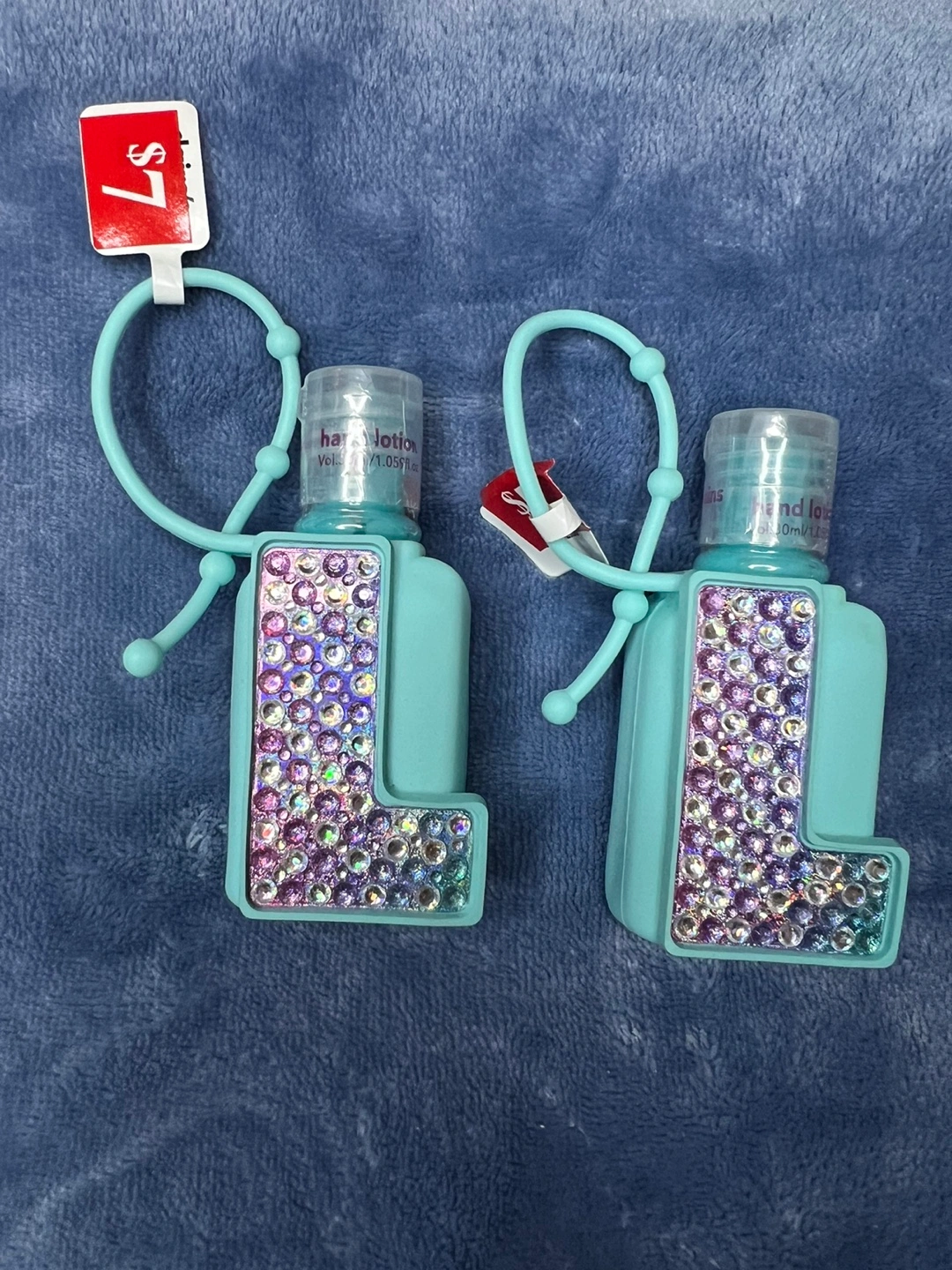 Two hand lotion bottles with rhinestone L charms. Each bottle comes with a silicone strap.
