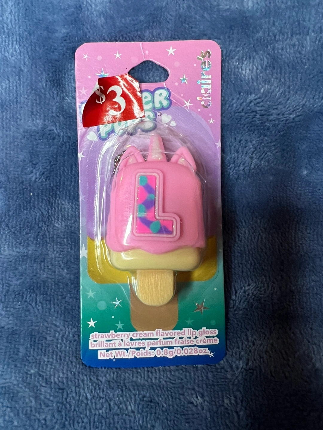 Strawberry cream flavored lip gloss. Comes in a popsicle shape with a unicorn on top.