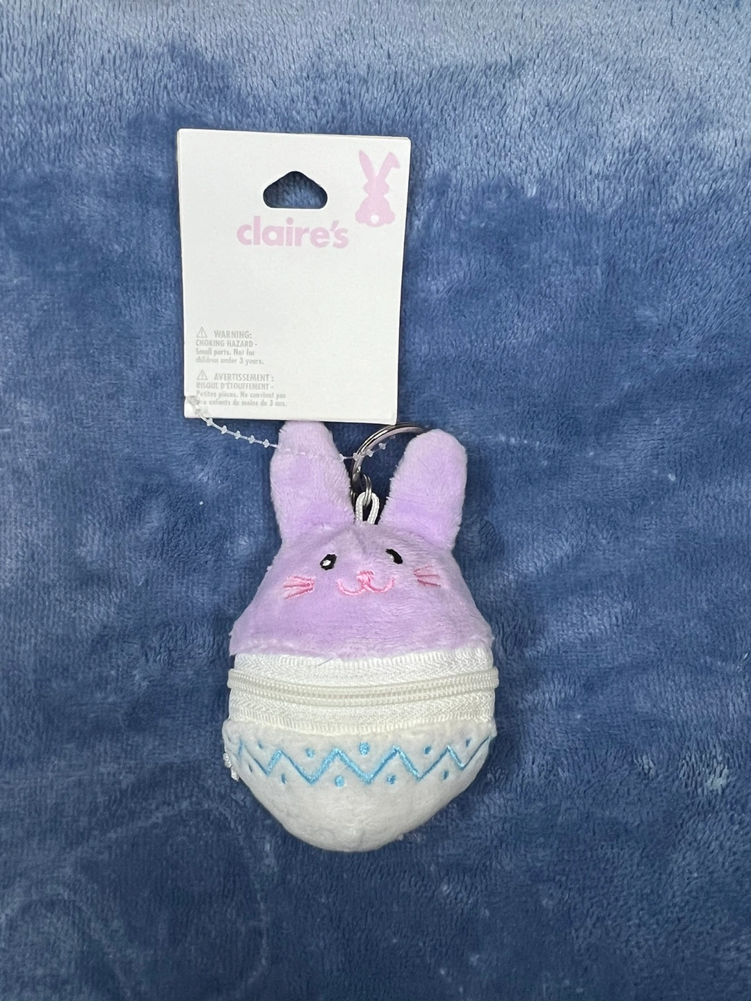Purple bunny plush keychain. The bunny is attached to an egg that has a zipper.