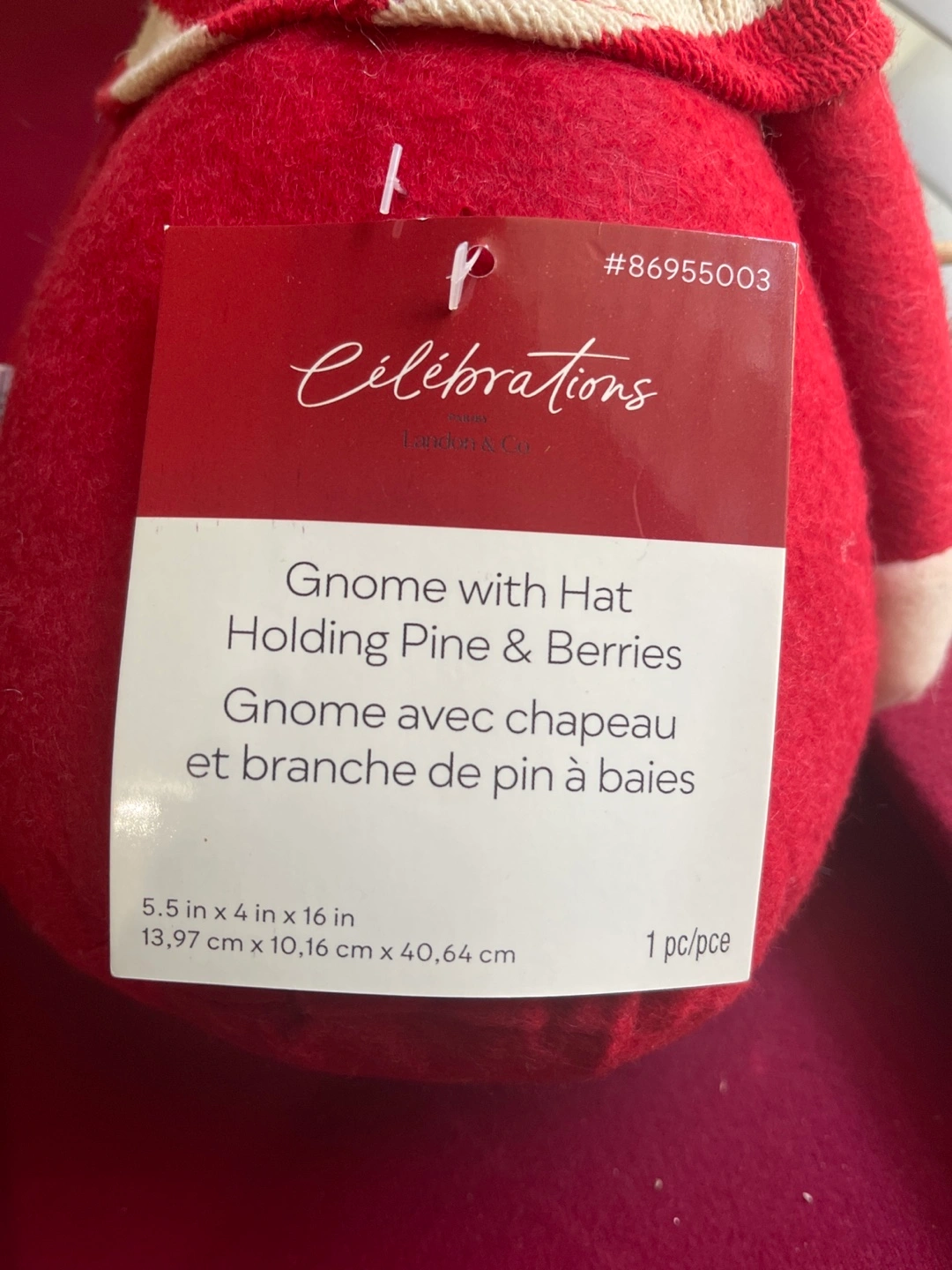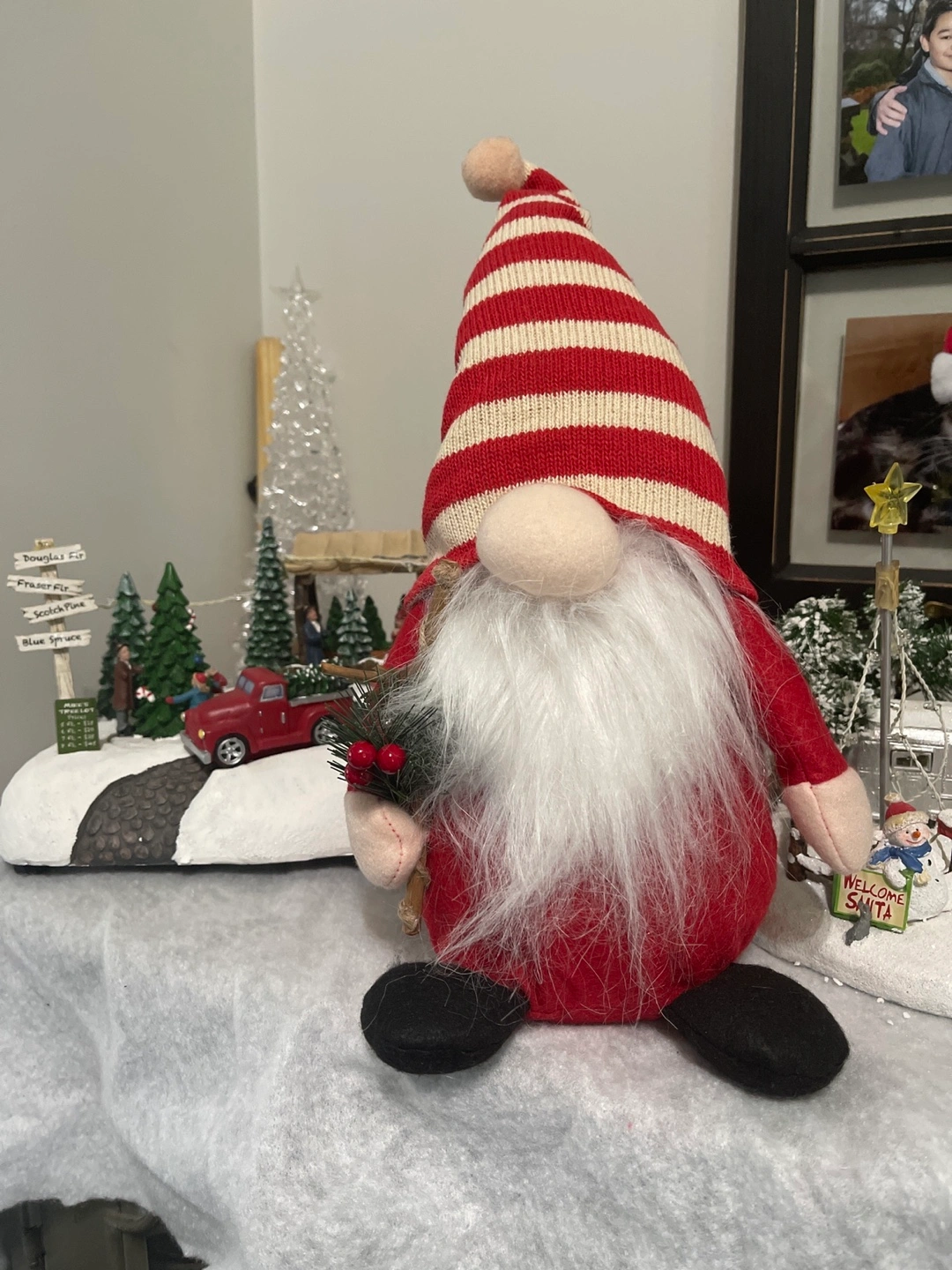 Red and white striped hat. Holding pine branch with red berries. Pick up in east Maple Ridge