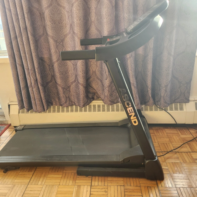 Treadmill in good condition. Includes a display that shows speed, time, distance, calories burned, pulse, and steps. Features incline, speed controls, and safety key.