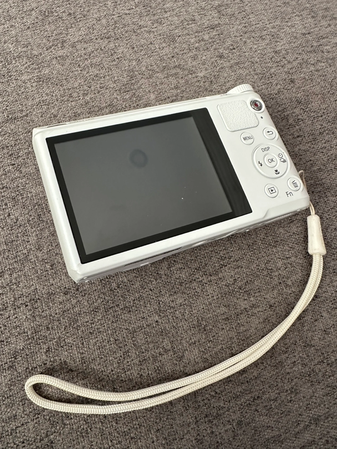 Preloved in great condition. White digital camera with 21x optical zoom, Wi-Fi connectivity, and a hybrid touch screen. Includes strap.