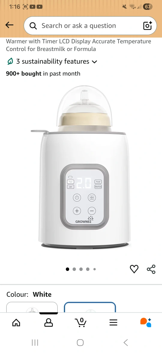 This is a Grownsy bottle warmer with timer and LCD display. It's white and has accurate temperature control for breastmilk or formula. It includes 3 sustainability features. Purchased for use at Grandparents house while visiting.