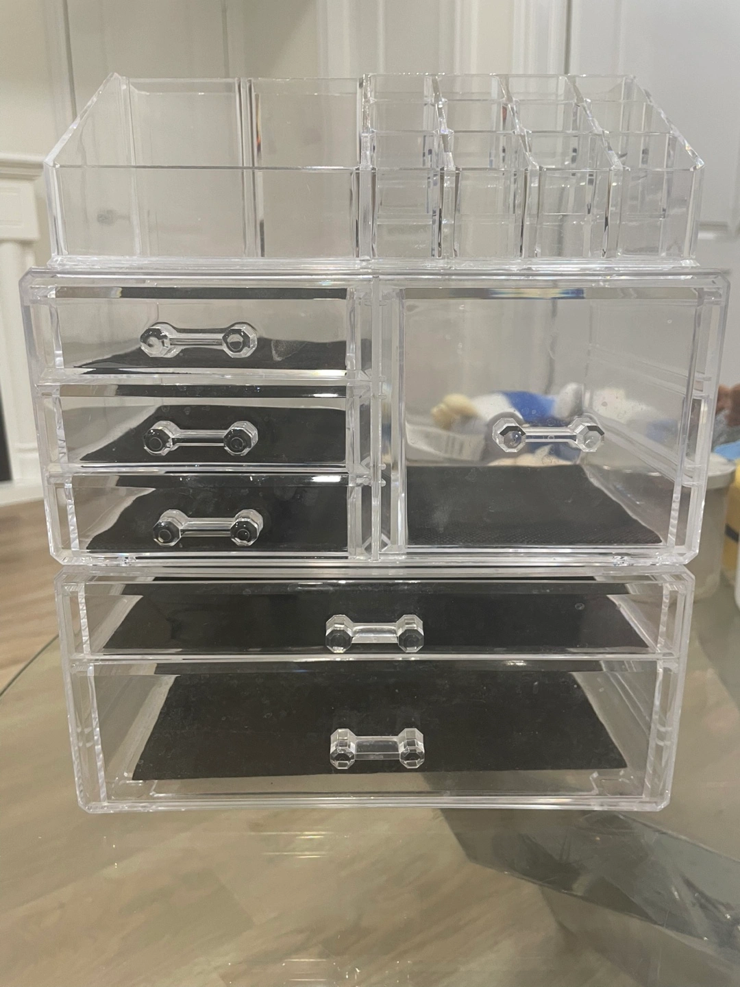 Clear acrylic makeup organizer with drawers. Includes compartments for different sized products.