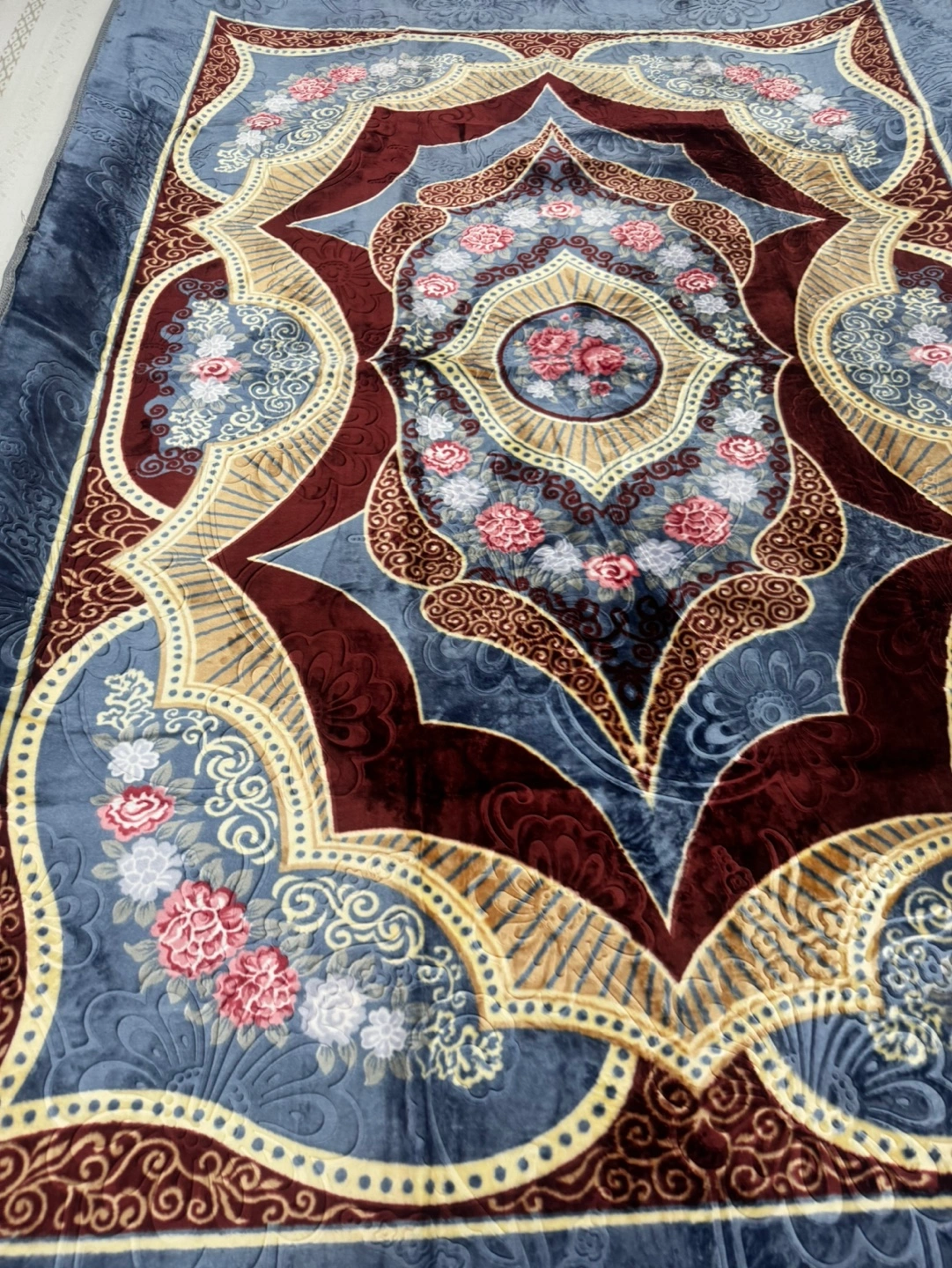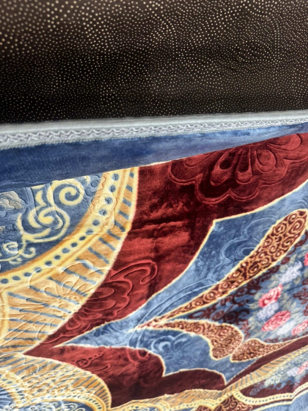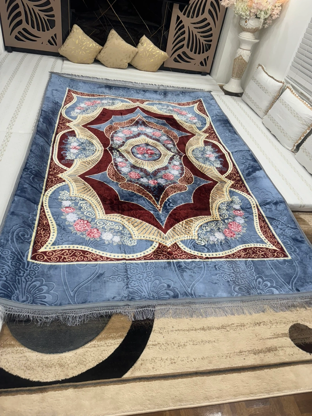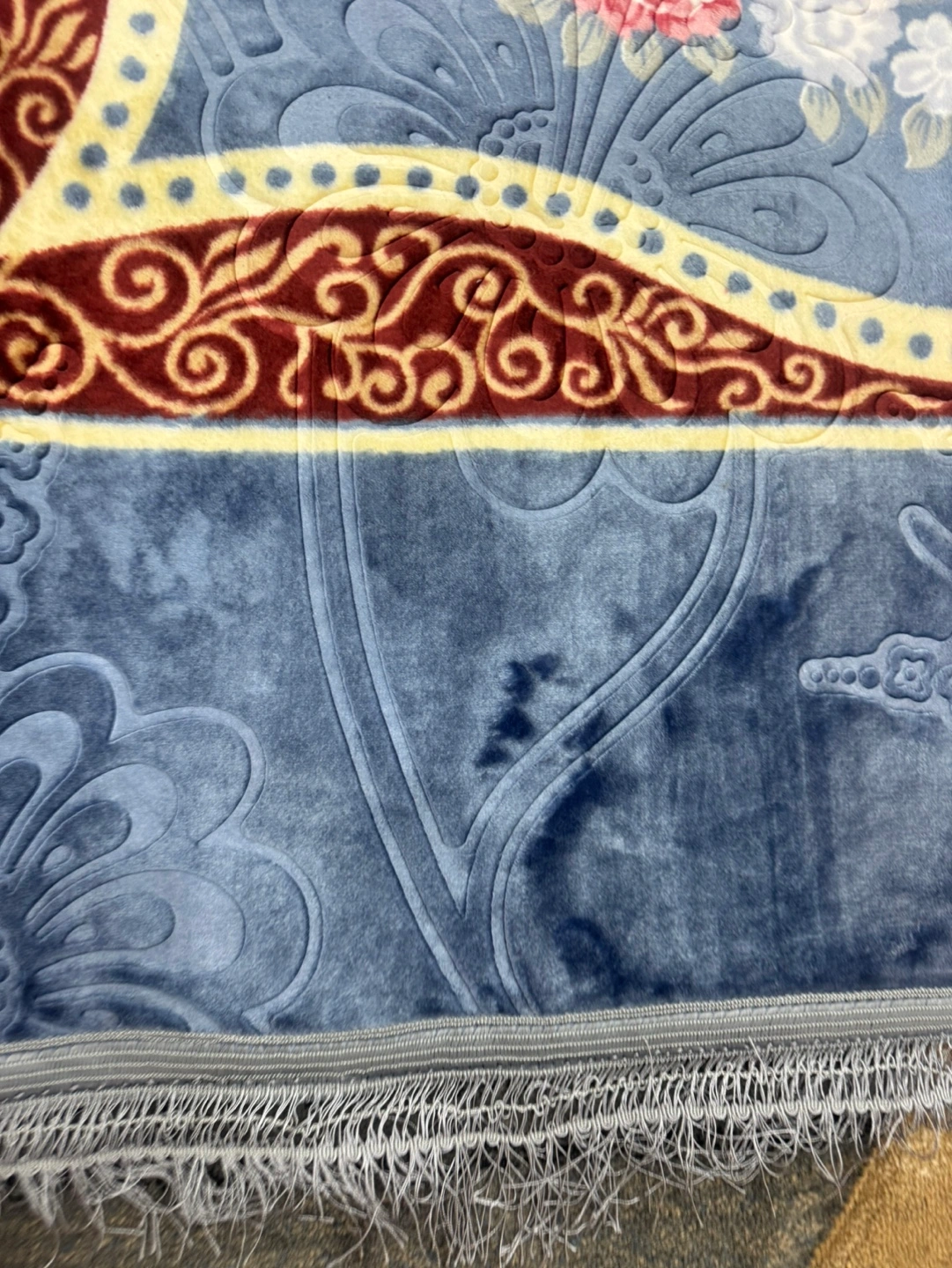Blue and red rug with floral pattern. Has fringe around the perimeter. Machine washable only $70 size 6.5 x 9.5 feet