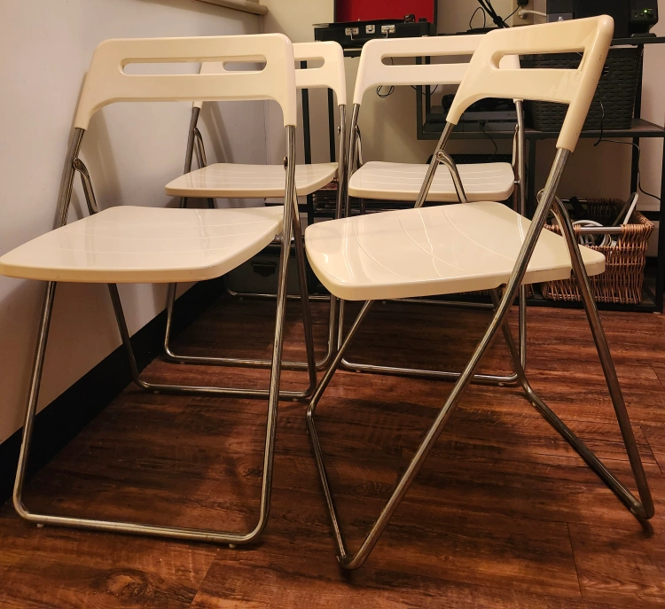 -Selling set of 4 stylish folding chairs, stainless steel frame and white/cream plastic seats.