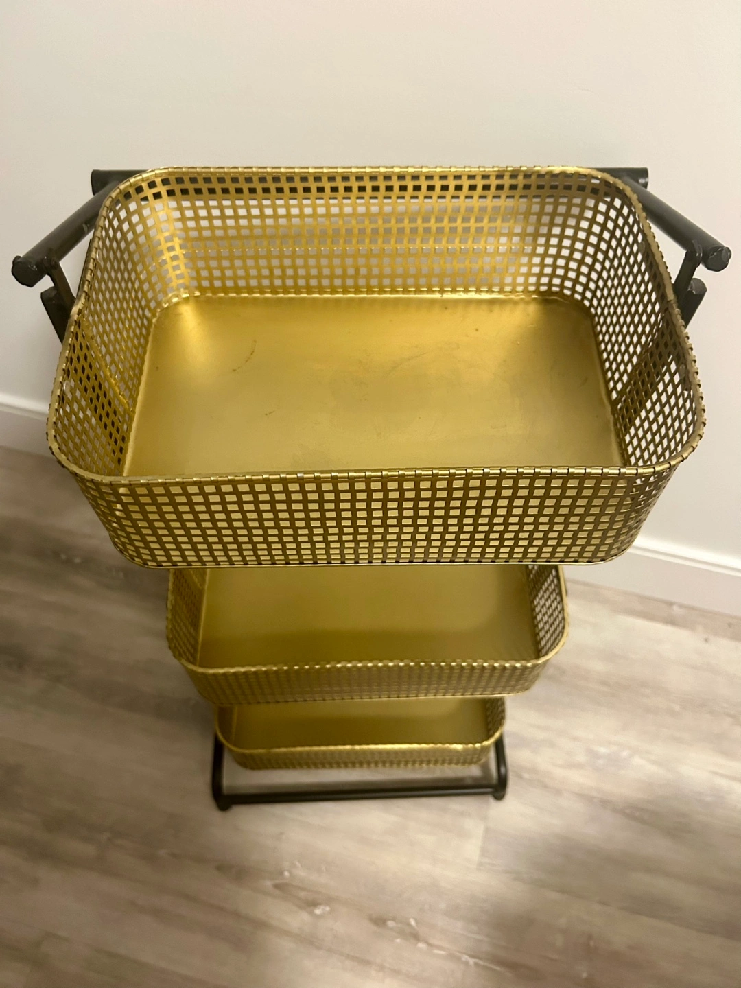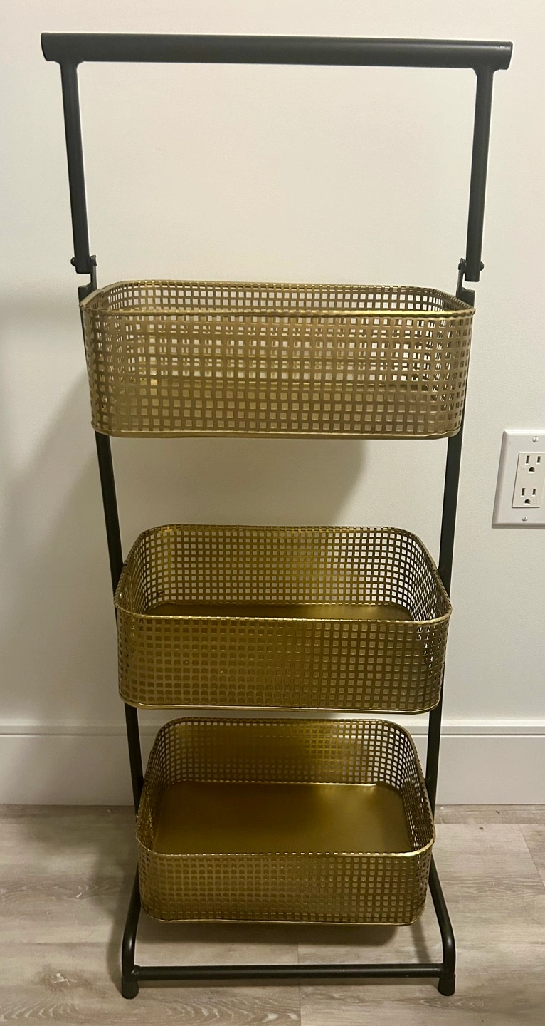 Three-tier metal storage shelf with gold finish and black frame. Can be used in a kitchen, bathroom or bedroom.