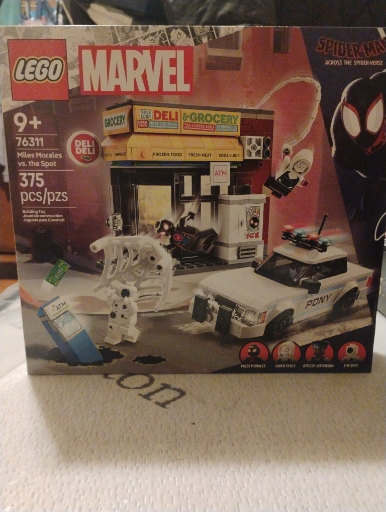 LEGO set 76311, includes Miles Morales, Gwen Stacy, Officer Jefferson, and The Spot minifigures. Includes a police car, a deli building, and other accessories.
